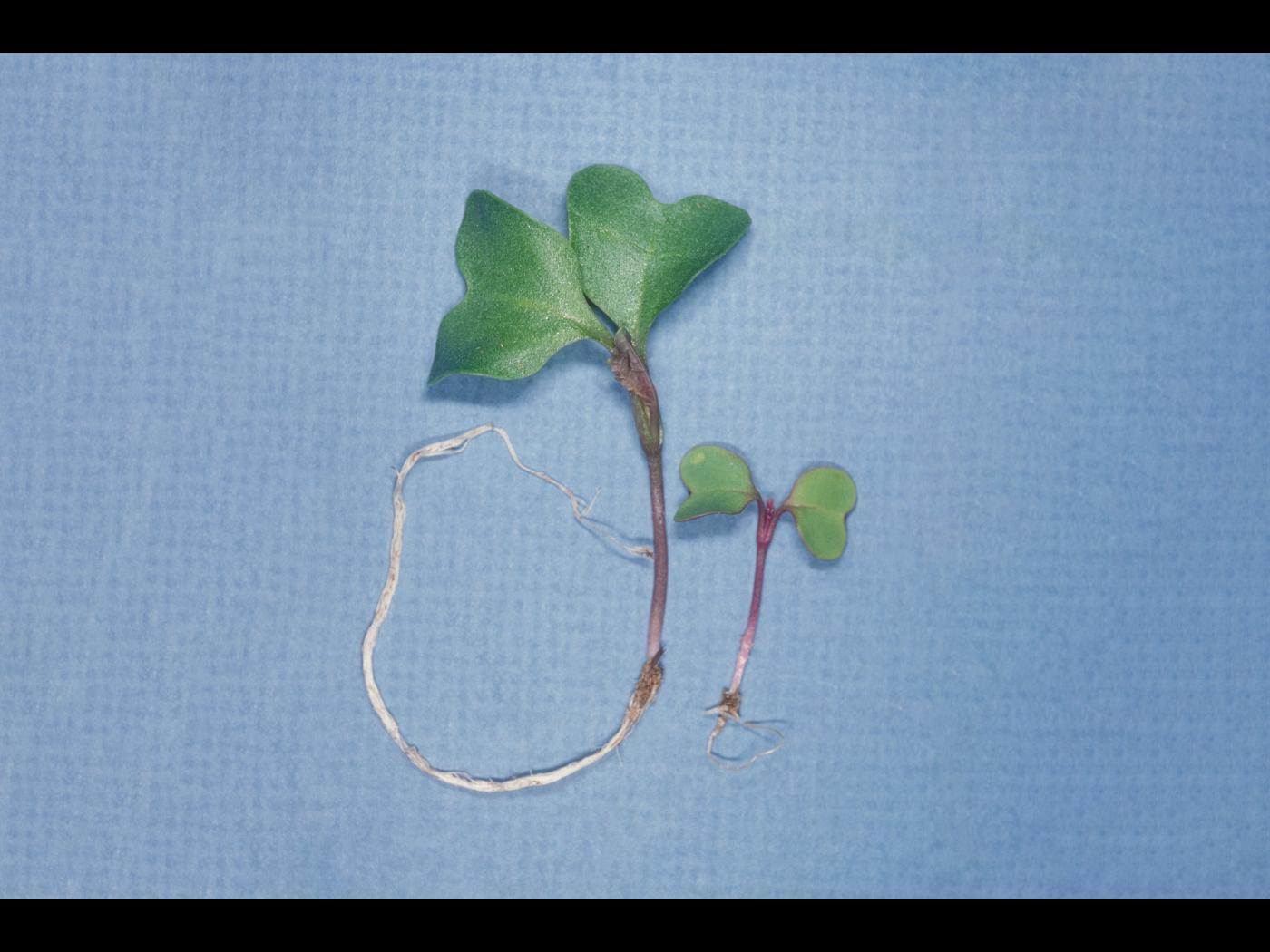 Description: Sur des plantules de chou-fleur cultivées en serre, la plantule de droite est faiblement développée lorsque comparée à la plantule sans symptôme. Sur la plantule affectée, les cotylédons ont une largeur de 1 cm et la marge et la face inférieure des cotylédons sont pourpres. La plantule n’a qu’une seule petite racine blanche. L’hypocotyle est sain. Les tests de laboratoire se sont avérés négatifs pour la détection de champignons dans les racines mais ont révélé un pH élevé du substrat (pH entre 7… En savoir plus