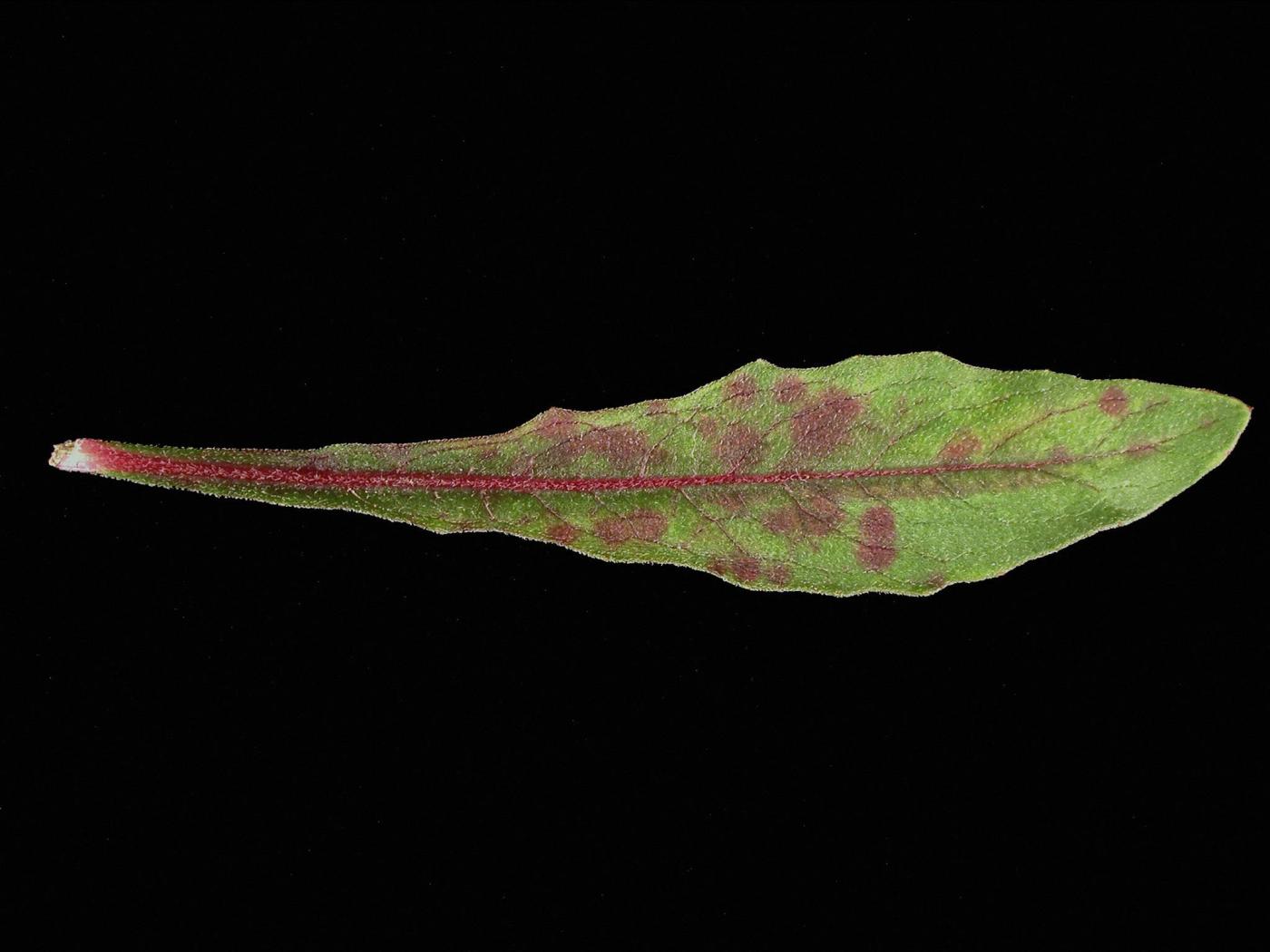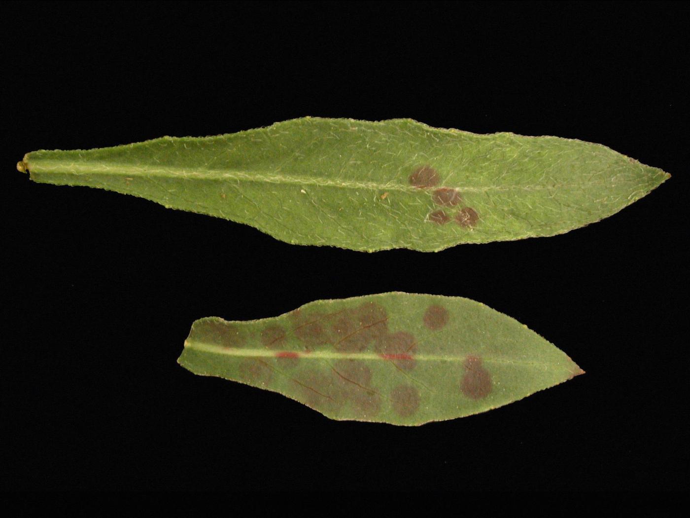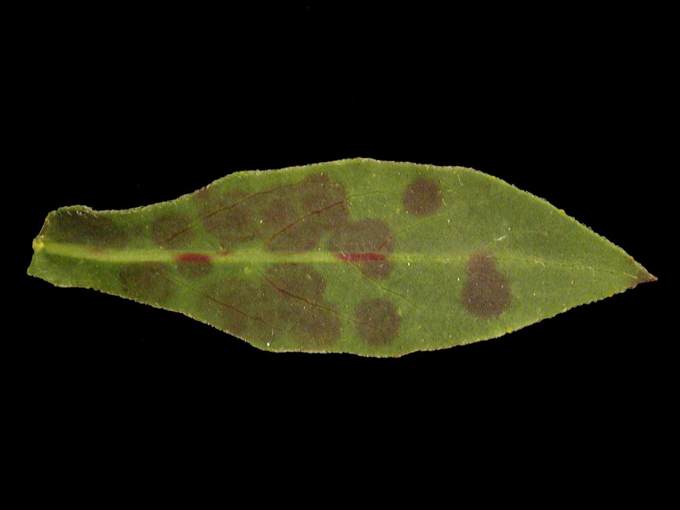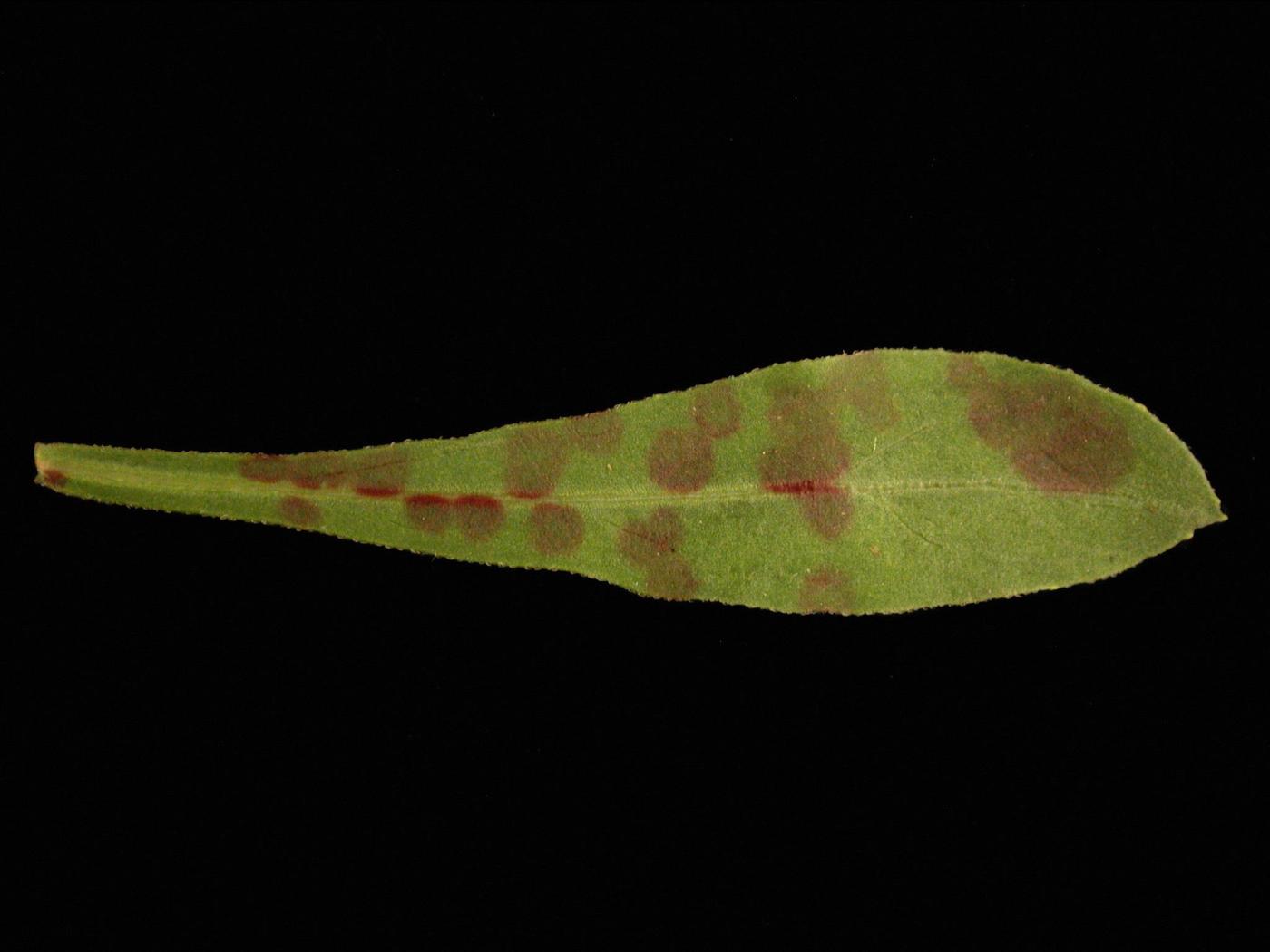 Description: Une feuille d’un plant de gaura montre des taches circulaires pourpres ne présentant pas de halo jaune. Le diamètre moyen des taches est de 1 à 2 mm. Elles sont réparties au hasard sur le limbe et la feuille affectée compte entre 10 et 20 taches. Les symptômes sont observés sur les feuilles basales. Les tests de laboratoire se sont avérés négatifs pour la détection de bactéries, de champignons et de virus. L’expression des taches rouges est liée à une caractéristique variétale.