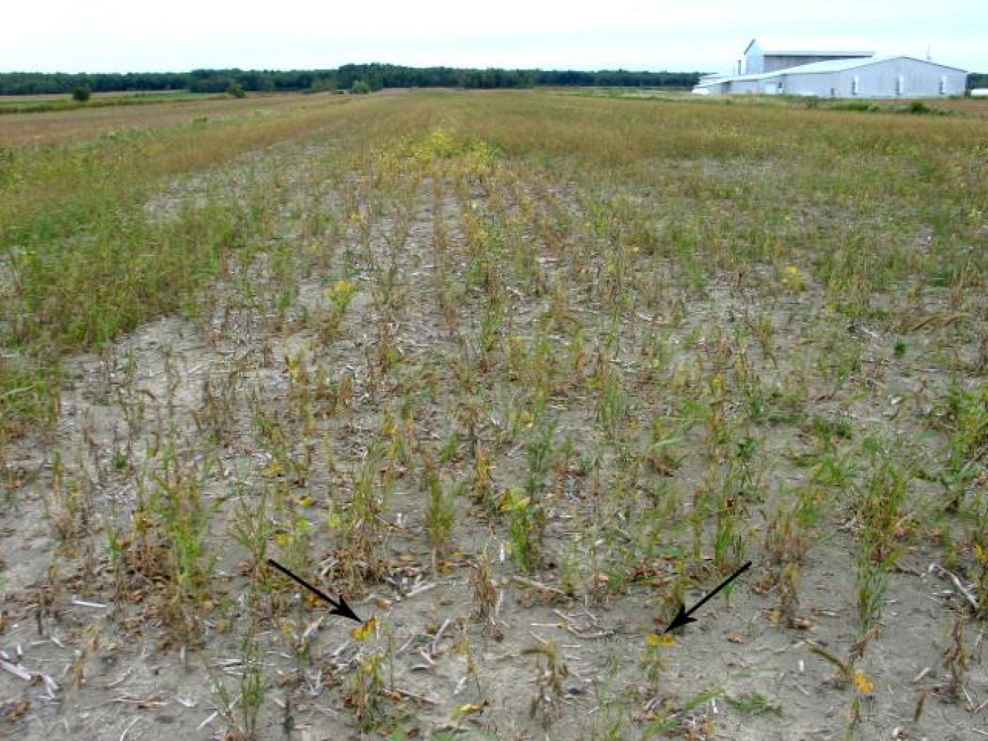 Description: Dans un champ de soya, les plants sont clairsemés et leur croissance est réduite. Certains plants sont dépéris et desséchés tandis que d’autres montrent un jaunissement du feuillage (voir flèches). Il y a également prolifération de mauvaises herbes. Ce semis a été fait sur un sol compacté et le taux de germination des semences est relativement faible.