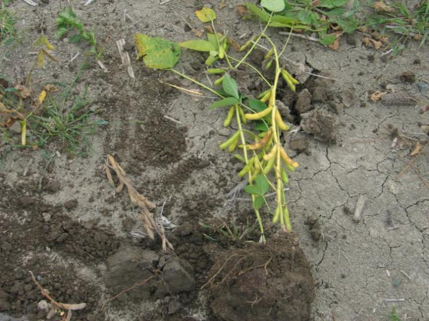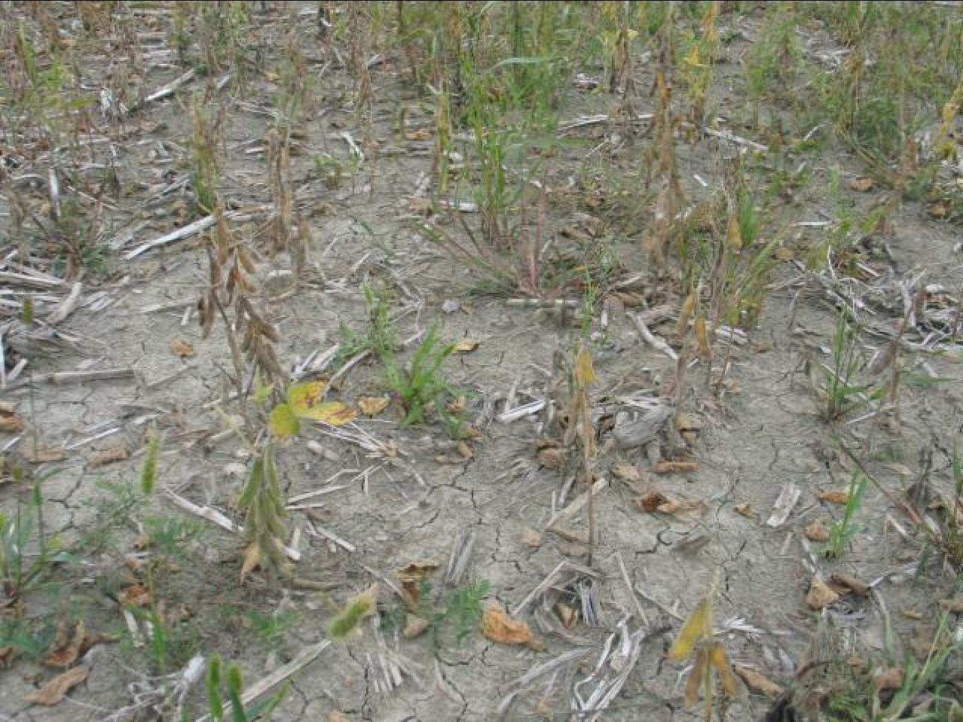 Description: Dans un champ de soya, les plants sont clairsemés et leur croissance est réduite. Certains plants sont dépéris et desséchés tandis que d’autres montrent un jaunissement du feuillage. Ce semis a été fait sur un sol compacté et le taux de germination des semences est relativement faible.