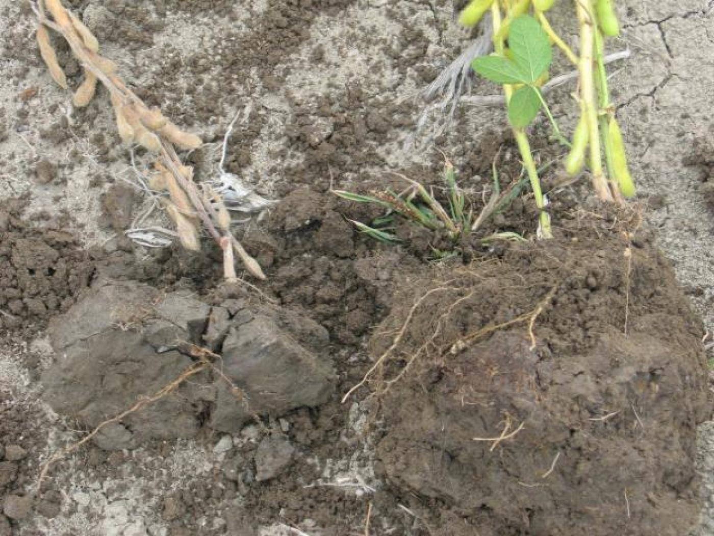 Description: Comparaison entre des plants de soya qui ont poussé dans un sol compacté (à gauche) et moins compacté. Le plant de gauche est dépéri, desséché avec un système racinaire restreint et des racines brunes. Les plants de droite ont une meilleure croissance malgré qu’ils commencent à jaunir. Les racines sont également mieux développées et blanches.
