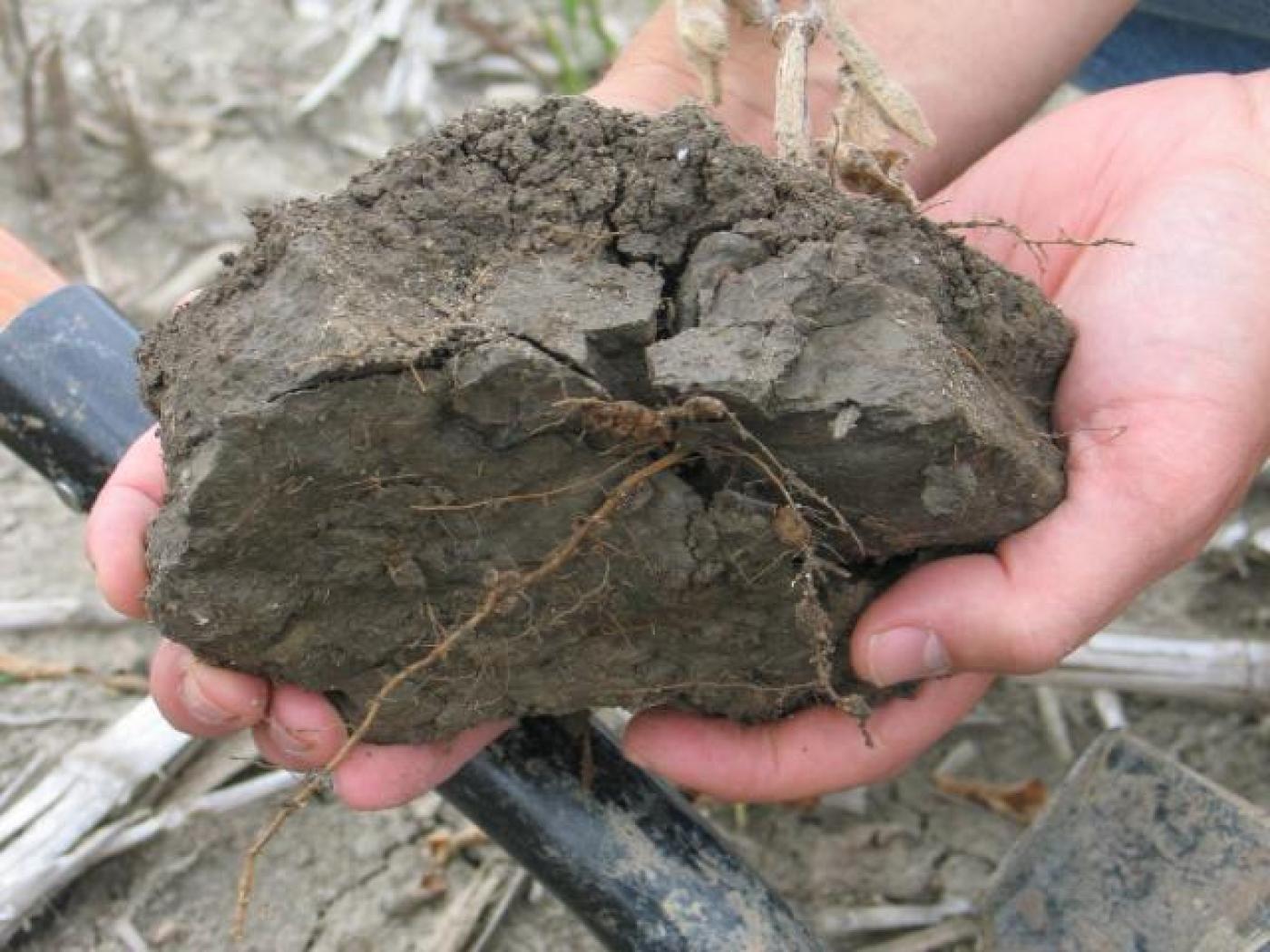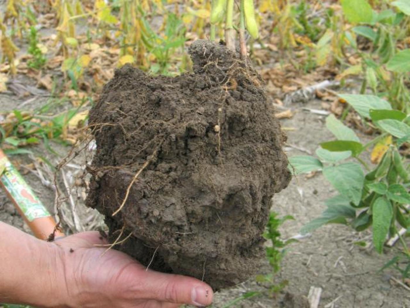 Description: Le développement du système racinaire d’un plant de soya qui a poussé dans un sol compacté est faiblement développé et les racines sont brunes et poussent à l'horizontale.