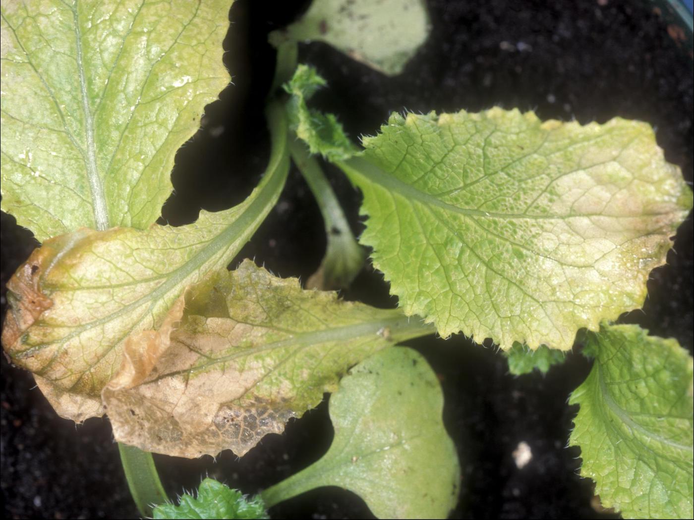 Plantule : présence d’une coloration grisâtre à blanchâtre du limbe des feuilles déployées ou non. Parfois présence d’une brûlure marginale. Dessèchement et mort des tissus affectés.