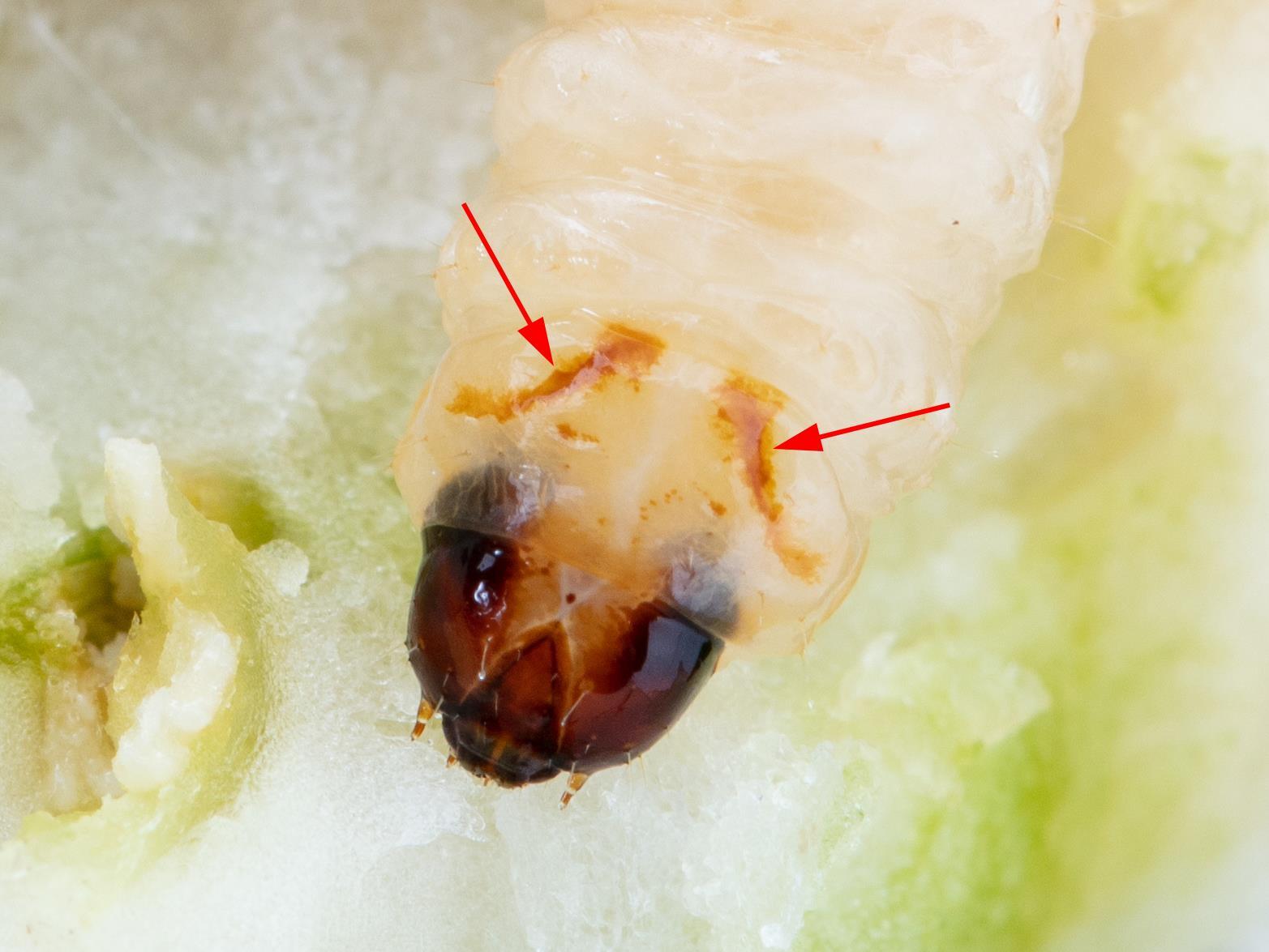 : Vue rapprochée de la tête de la larve. On y observe les lignes brunes convergeant dans la section postérieure de la plaque thoracique.
