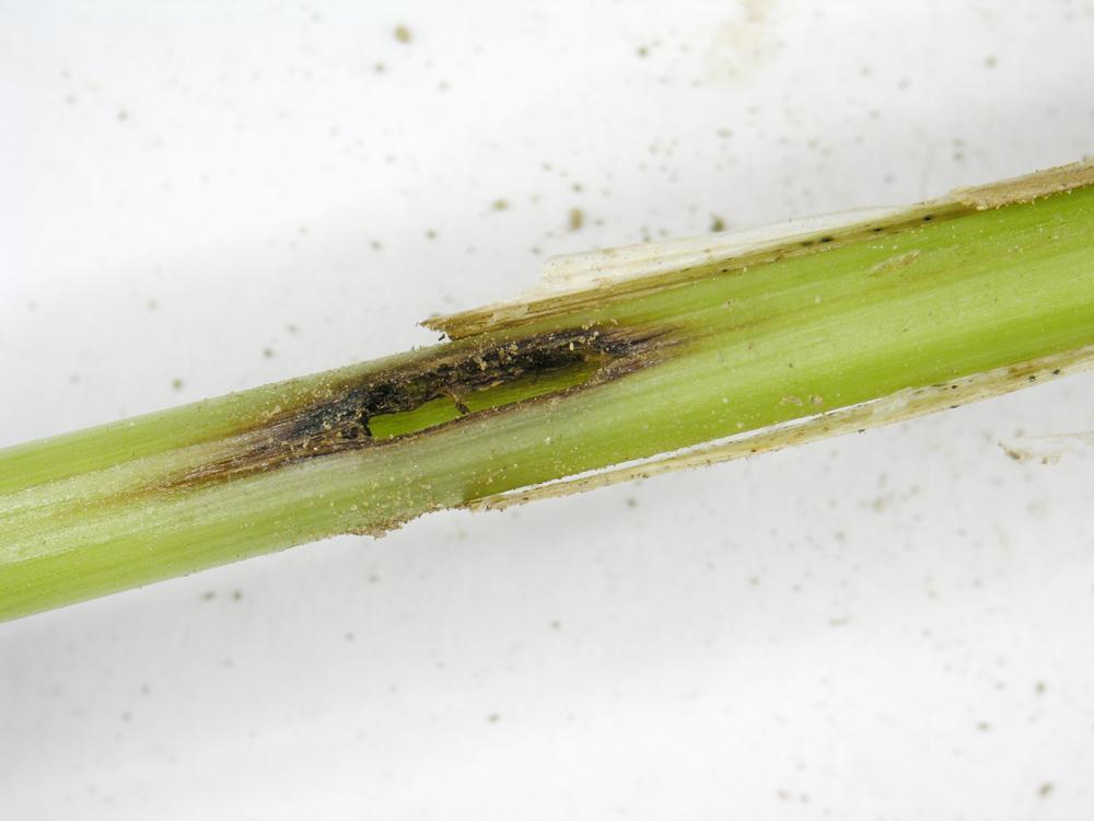 : Tige de blé présentant des dommages causés par la mouche de Hesse : les larves grignotent la tige et possèdent une salive toxique qui favorise une perte de sève de la plante et qui bloque sa croissance.