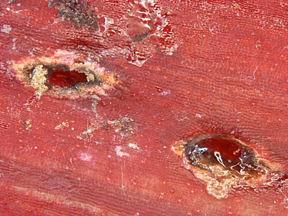 Gros plan de deux piqûres sur le pétiole d'une feuille de rhubarbe : la larve et l'adulte piquent la plante et injectent une enzyme entraînant la nécrose des tissus, puis se nourrissent des fluides. Ce type de dommage est commun dans la culture du céleri, mais peu documenté sur la rhubarbe.