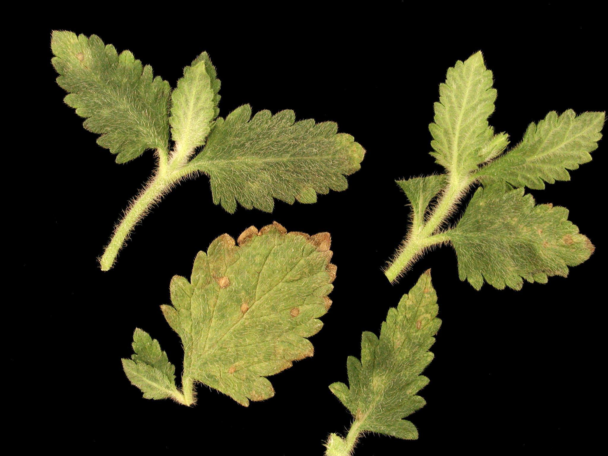 Description: Les jeunes feuilles de verveine présentent des taches ou zones irrégulières vert pâle à jaunes et de minuscules taches brunes et sèches entre les nervures. Sur la feuille plus âgée, présence d’une brûlure marginale et de quelques taches brunes et sèches sur le limbe. Les tests de laboratoire ont révélé la présence du virus de la tache nécrotique de l'impatiente (INSV).