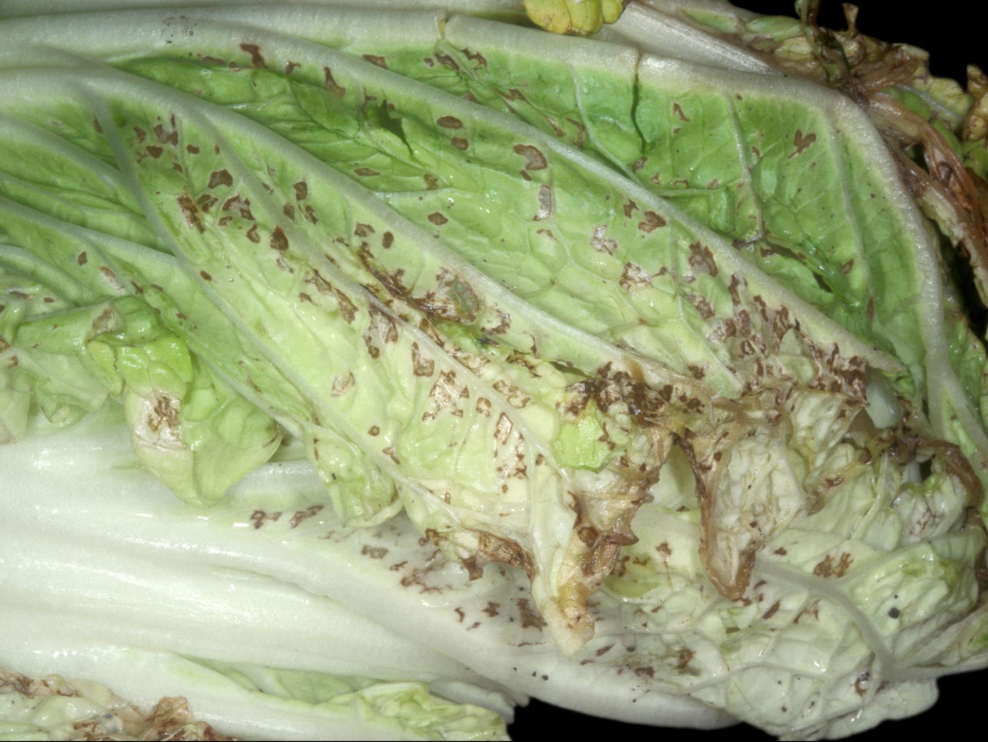 Description: Sur un plant de chou chinois provenant d’un champ, présence de nombreuses petites taches grisâtres localisées près des nervures des jeunes feuilles. Sur les vieilles feuilles, les taches forment de grandes zones beiges à grisâtres d’aspect humide. Les tests de laboratoire ont révélé la présence d’un Potyvirus. Il s’agit probablement du virus de la mosaïque du navet qui cause des symptômes similaires à ceux observés sur ce plant. La conseillère mentionne que 90 % des plants sont affectés au champ, ce qui est inhabituel pour une maladie virale. Notez que la nervation noire (Xanthomonas campestris pv. campestris) n’a pas été détectée dans les tissus malades.
