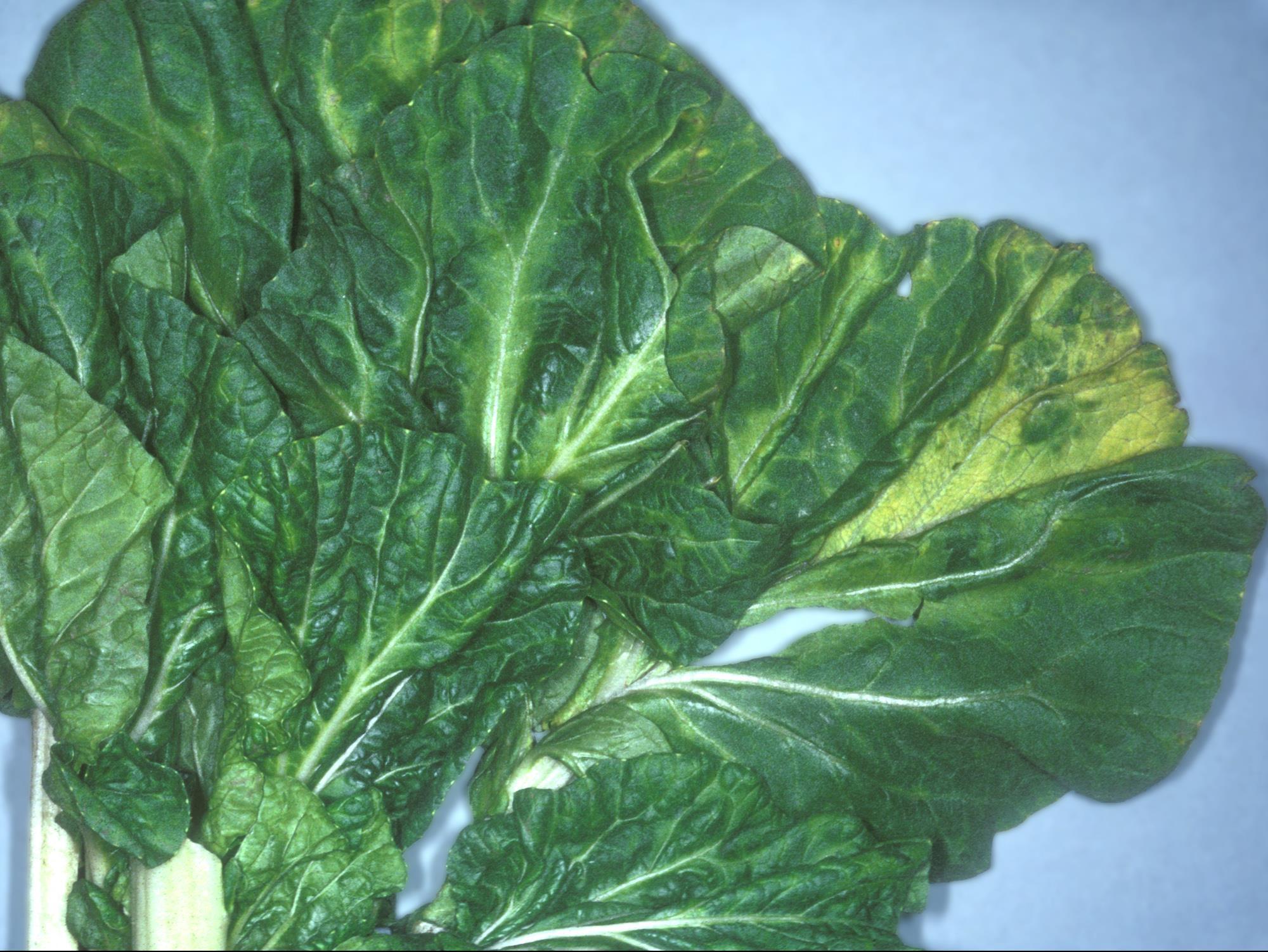 Description: Une feuille de chou chinois provenant d’un champ montre un jaunissement entre les nervures et le long des nervures. Les feuilles sont également gaufrées. Tous les niveaux de feuille sur les plants sont affectés. Les tests de laboratoire ont révélé la présence d’un Potyvirus. Il s’agit probablement du virus de la mosaïque du navet qui cause des symptômes similaires à ceux observés sur les plants reçus. La conseillère agricole mentionne que tous les plants de la vieille plantation sont affectés tandis que les deux tiers des plants de la jeune plantation le sont.