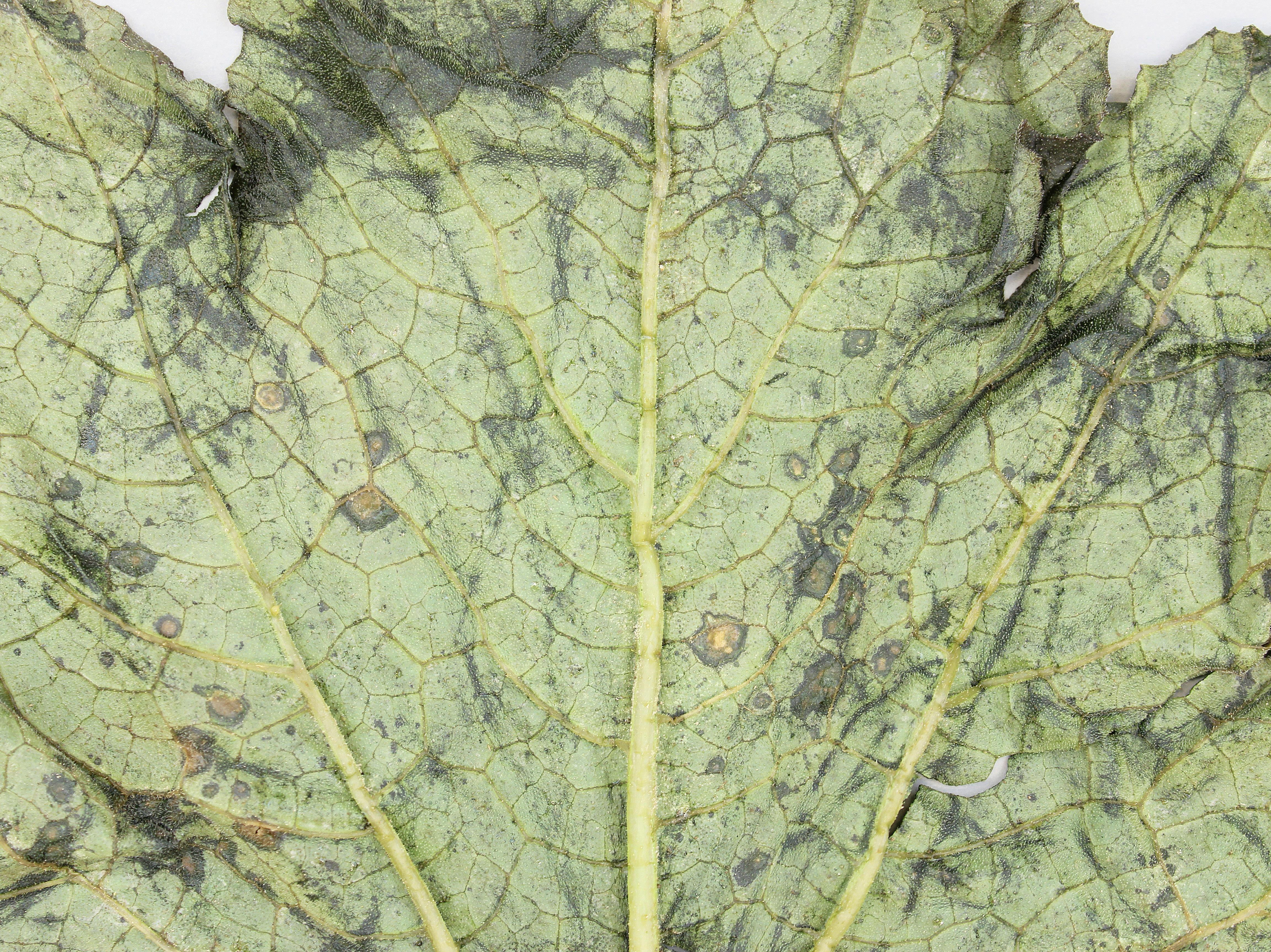 Description: À la face inférieure d'une feuille basale de courgette provenant d’un champ, présence de taches brunes à contour foncé, plutôt rondes, mais angulaires lorsqu’elles sont accolées aux nervures. Elles sont distribuées au hasard sur le limbe. Les tests de laboratoire ont révélé la présence de la bactérie Pseudomonas syringae, responsable de la tache angulaire.