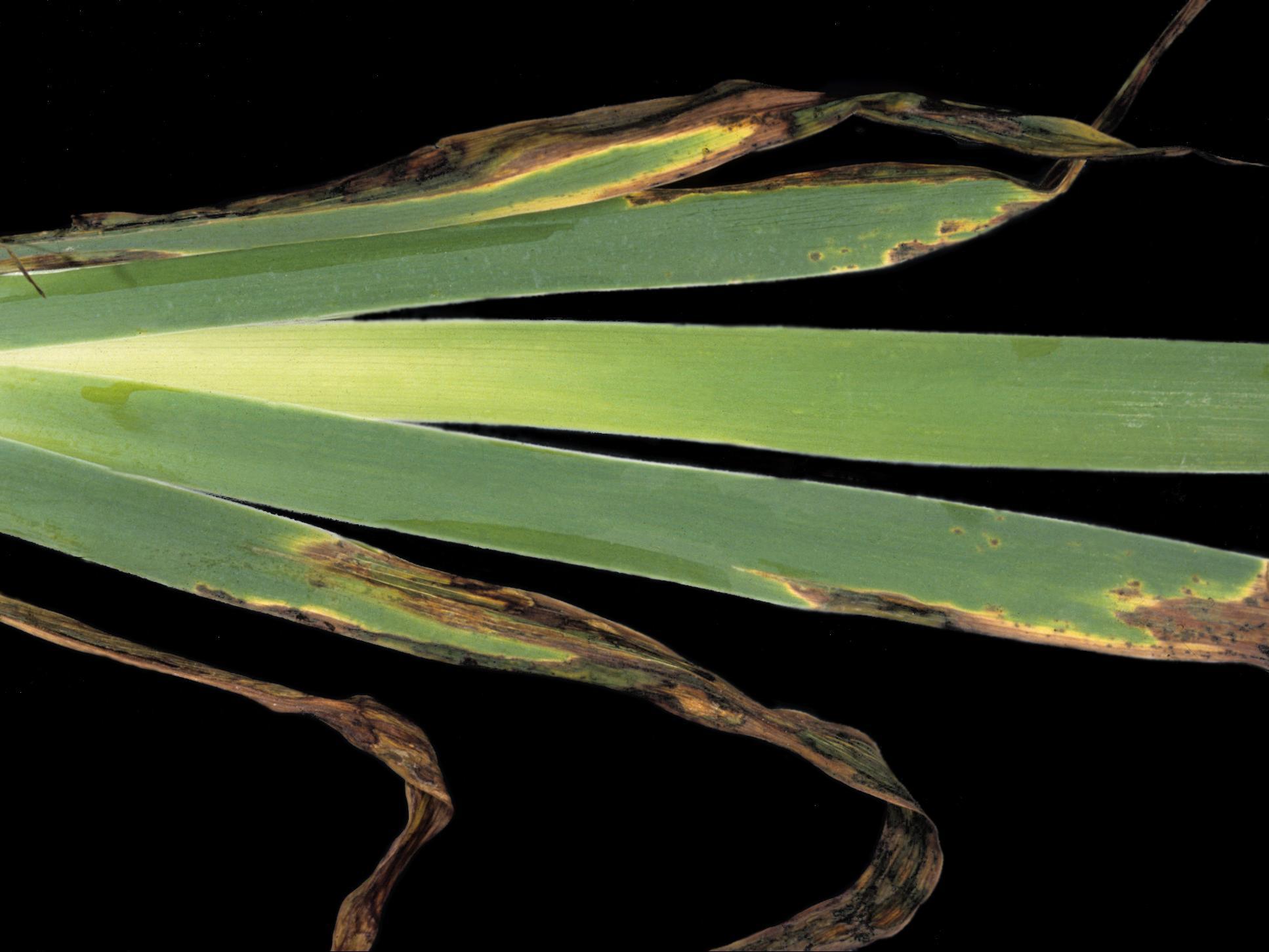 Description: Les feuilles basales et médianes d’un iris présentent des brûlures brunes débutant à l’apex et progressant ensuite à la marge. Un halo jaune entoure les brûlures. Les tests de laboratoire ont révélé la présence de la bactérie Xanthomonas sp., responsable de la tache bactérienne. Chez l’iris des jardins, la bactérie Xanthomonas campestris pv. tardicrescens est rapportée.