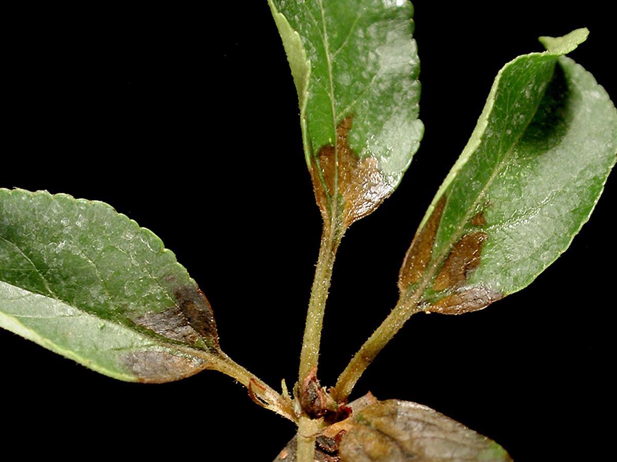 Description: Une vue rapprochée de l’extrémité d’une pousse d’un pommier (cv 'Honey Gold') montre un brunissement des pétioles et de la base du limbe. Les tests de laboratoire ont révélé la présence de la bactérie Erwinia amylovora, responsable de la brûlure bactérienne.