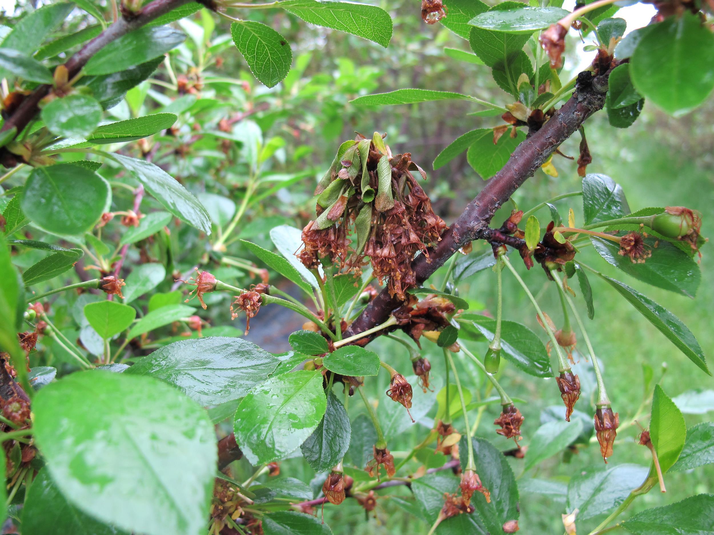 Description: On remarque sur la photo une forte pression de la bactérie Pseudomonas syringae sur les nouvelles pousses et les bouquets floraux du cerisier nain rustique. Les fleurs sont flétries et brunies, mais restent accrochées à la tige.