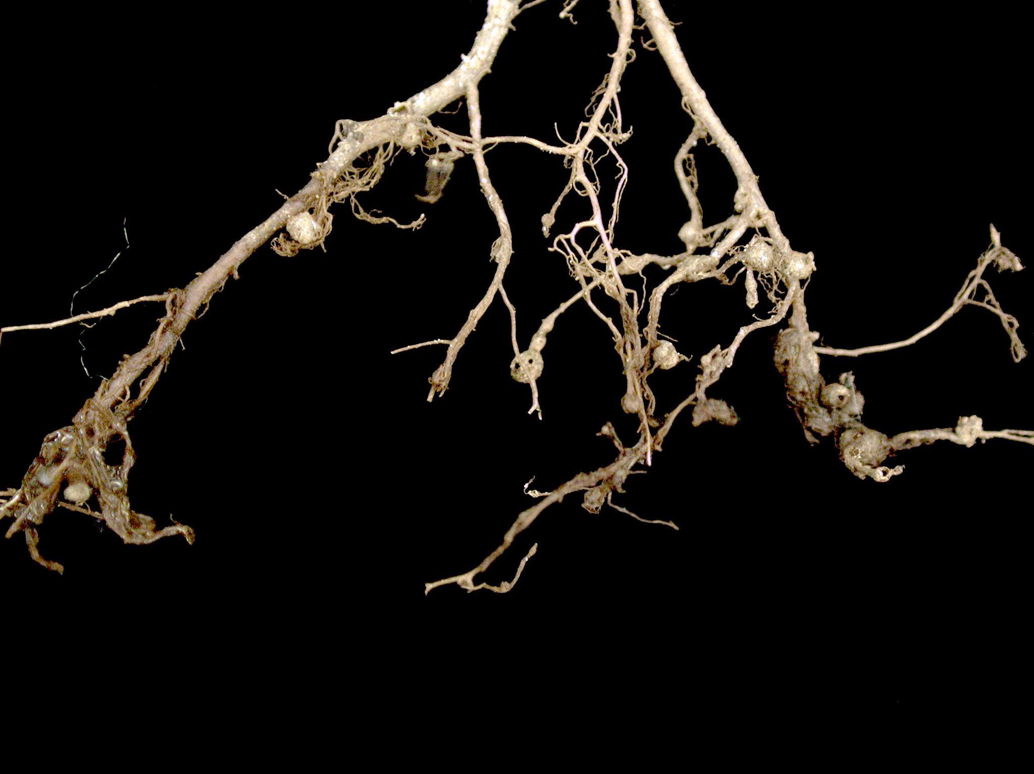 Description: Le système racinaire d'un bégonia jamaïcensis est peu développé. Les racines sont brunes et portent des nodosités distribuées aléatoirement sur celles-ci. La tige et les feuilles sont flétries (non visible ici). Les observations microscopiques des nodules ont révélé la présence du nématode Meloidogyne sp. Ce nématode est responsable de la nodosité des racines.
