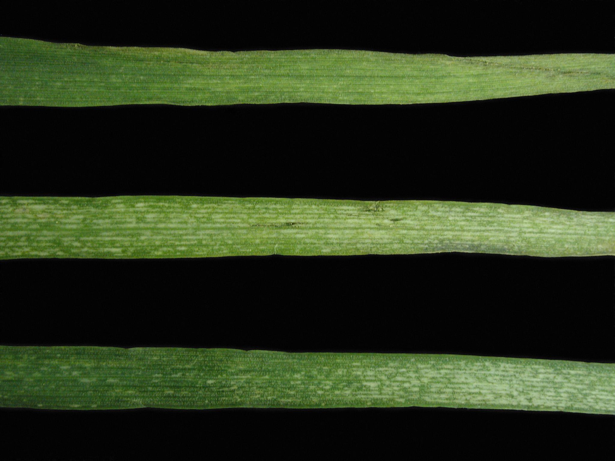 Description: La face supérieure des feuilles de blé de printemps montre de minuscules taches blanches longitudinales concentrées vers l’apex de la feuille. Ces symptômes sont caractéristiques du froid qui a atteint les plantes lors de nuits froides et de matinée ensoleillée. Il y a perte de chlorophylle dans les cellules d’où l’apparition des taches blanches.
