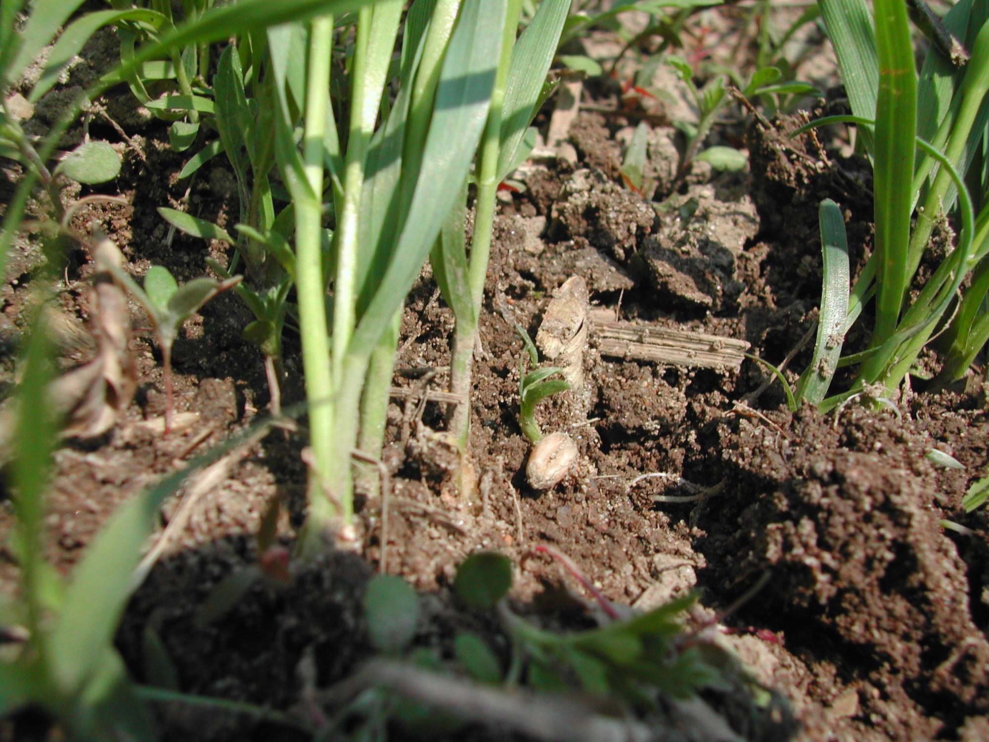 Description: La semence de blé de printemps a été semée trop en surface et n’a pas germé. Le pourtour de la graine est noirci ou pourri.