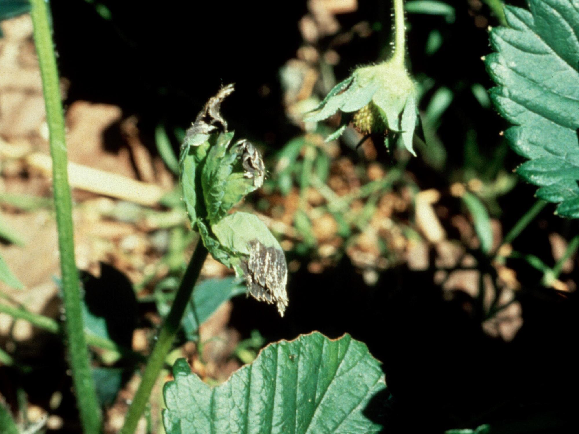 Description: L’extrémité des folioles d’une jeune feuille de fraisier est brune. Ce dommage représente un des symptômes caractéristiques d’une carence en calcium.