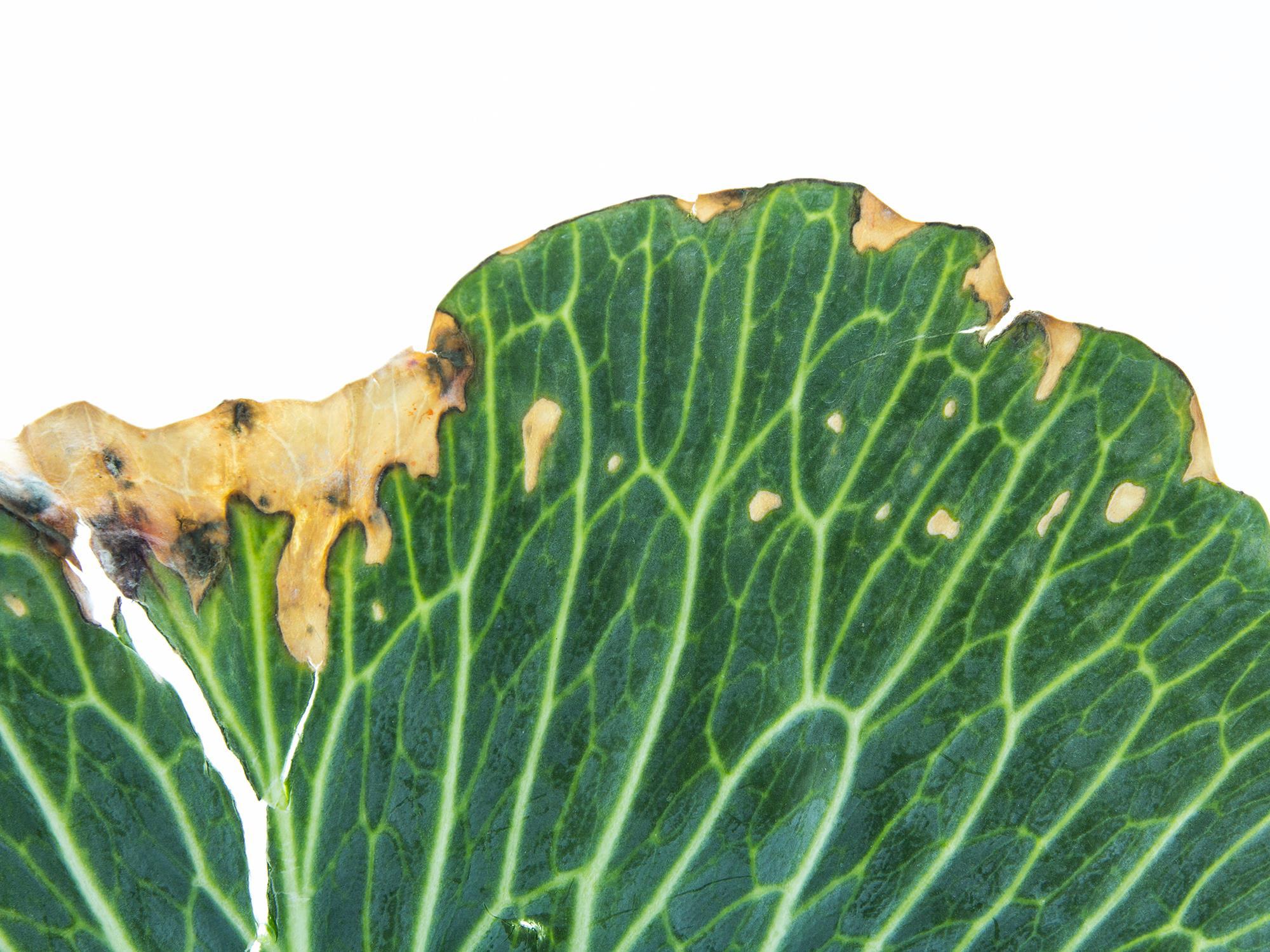 Légende: Brûlures beiges bien délimitées à l'apex d'une feuille de chou pommé