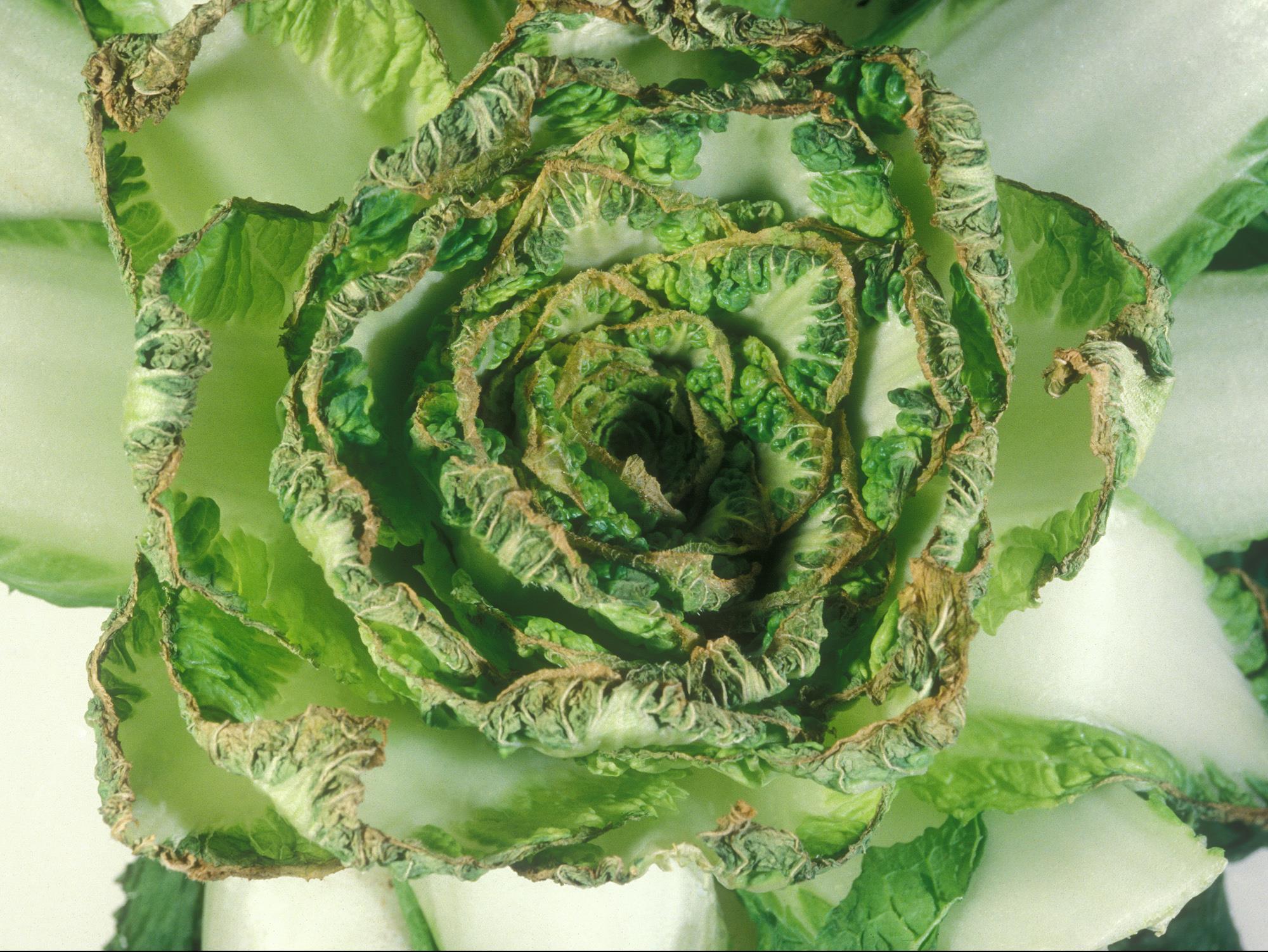 Description: Sur un plant de chou chinois provenant d’un champ, présence d’une brûlure brune de l’extrémité des feuilles médianes et terminales, suivie d’une déformation et d’un gaufrage de la partie apicale de ces feuilles. Ces symptômes sont typiques d’une carence en calcium et causent la brûlure de la pointe.