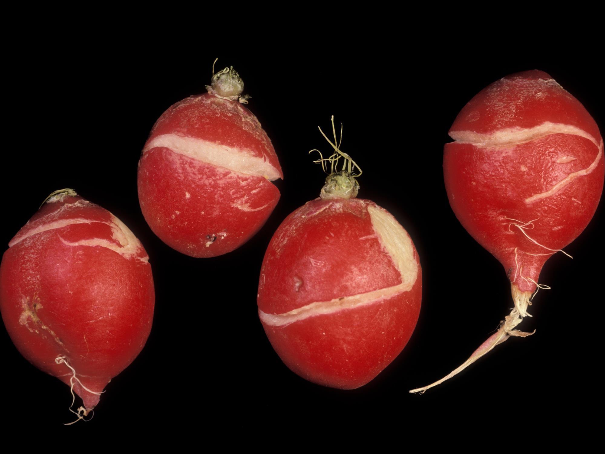Description: À la récolte, des radis (cv 'Scarlet Knight') présentent de larges fentes horizontales pouvant à l’occasion faire entièrement le tour de la racine. Les fentes sont localisées dans la moitié supérieure du radis. Les examens microscopiques n’ont pas révélé la présence d’agents pathogènes. Les dommages sont attribuables aux chocs des radis l’un sur l’autre lors de la récolte mécanique. Il s’agit de blessures mécaniques.