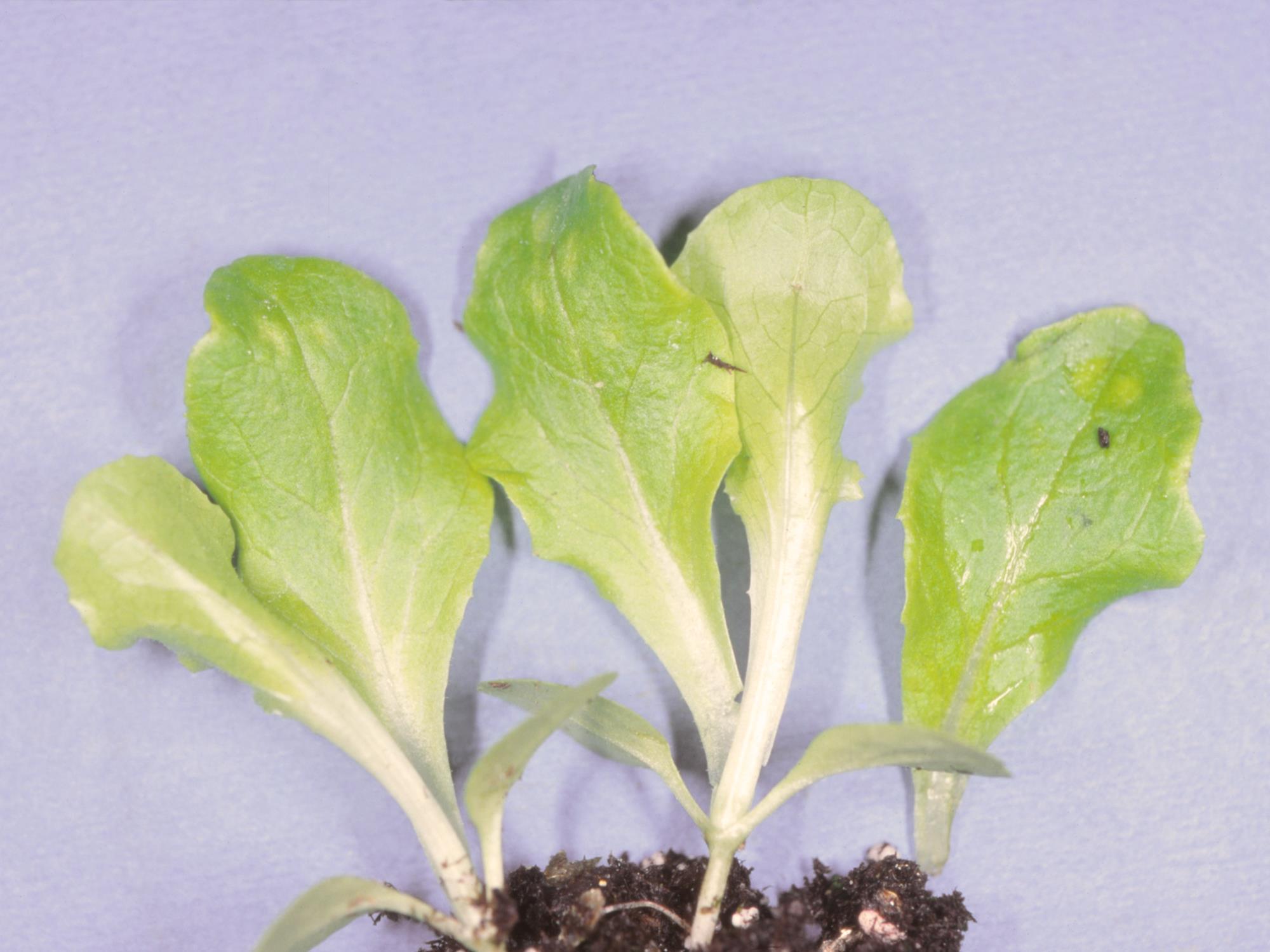 Description: Des plantules de laitue, âgées de deux semaines, montrent des taches jaunes sur le limbe dans la partie distale de la feuille. La face inférieure est sans symptôme. Les tests de laboratoire ont révélé un pH de 6,9 et une conductivité électrique de 1,4 mS/cm en sol organique. Le pH est élevé pour des plantules de laitue, il devrait se situer entre 6,0 et 6,5. De plus, les observations microscopiques ont révélé la présence de cristaux bleutés provenant de granules de fertilisants sur les taches. La répartition des symptômes dans la région de l’apex et la présence de trace de fertilisant sur les tissus affectés suggèrent une blessure de contact par les engrais.