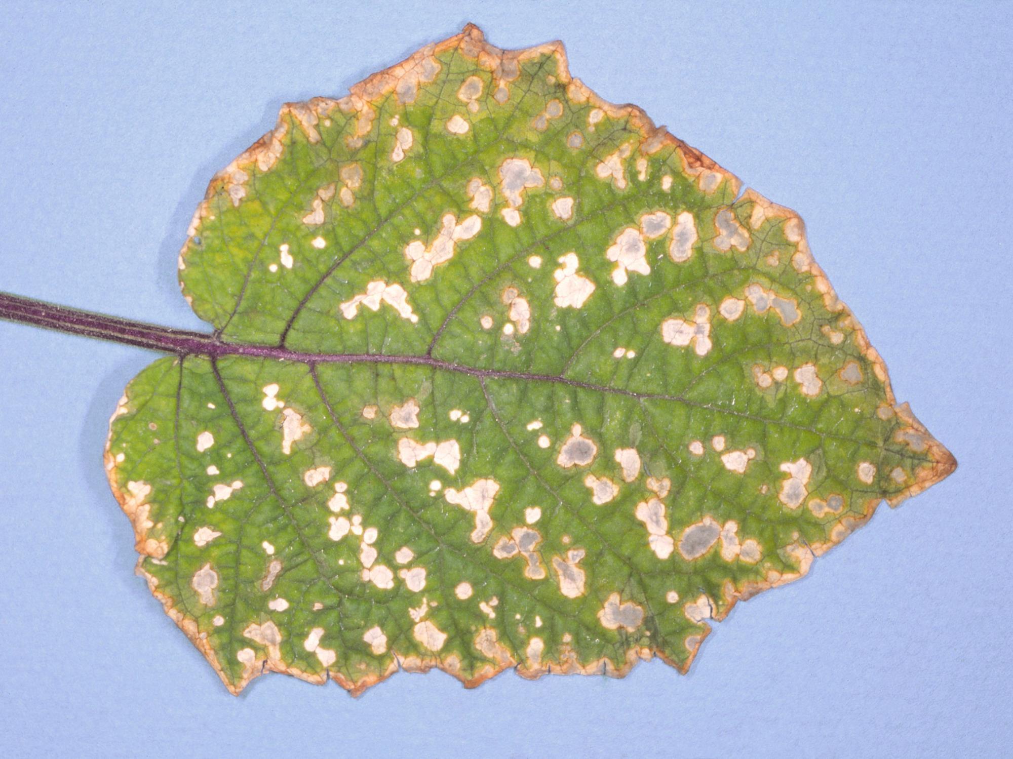 Description: Une feuille de cerise de terre montre des taches blanches situées entre les nervures. Les taches peuvent se regrouper. Les tests de laboratoire ont révélé la présence du champignon Alternaria sp. des brûlures, mais dans le cas présent, ce champignon est considéré comme un organisme secondaire. Il a profité des brûlures foliaires pour envahir les tissus. Les dommages seraient d’origine non parasitaire, car les brûlures sont localisées entre les nervures. Les symptômes pourraient être attribuables à une température élevée de l’air (chaleur) causant une perte d’eau excessive par le feuillage lors de journées chaudes (début août). De plus, s’il y a un excès d’eau, les racines ont pu se retrouver dans des conditions asphyxiantes pour un certain temps. Ainsi, les racines ne pouvaient absorber d’eau pour combler la partie d’eau perdue par le feuillage causée par une transpiration excessive.