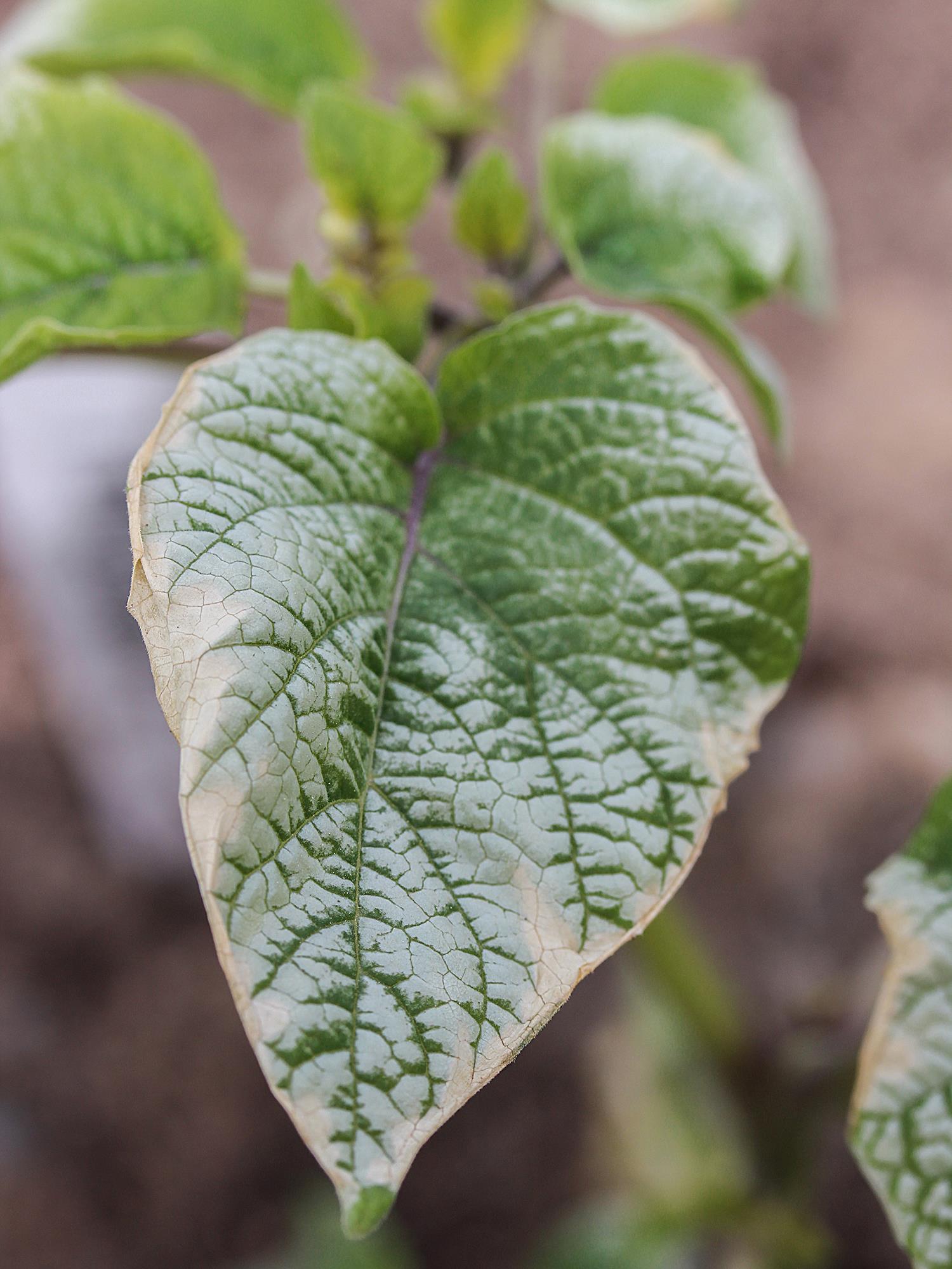 Description: Une feuille de cerise de terre montre un blanchiment du limbe débutant à la marge et progressant entre les nervures. Une brûlure de la marge de la feuille est également visible. Tous les niveaux de feuilles étaient affectés. Les symptômes sont apparus à la suite d’un gel printanier survenu au début du mois de juin.