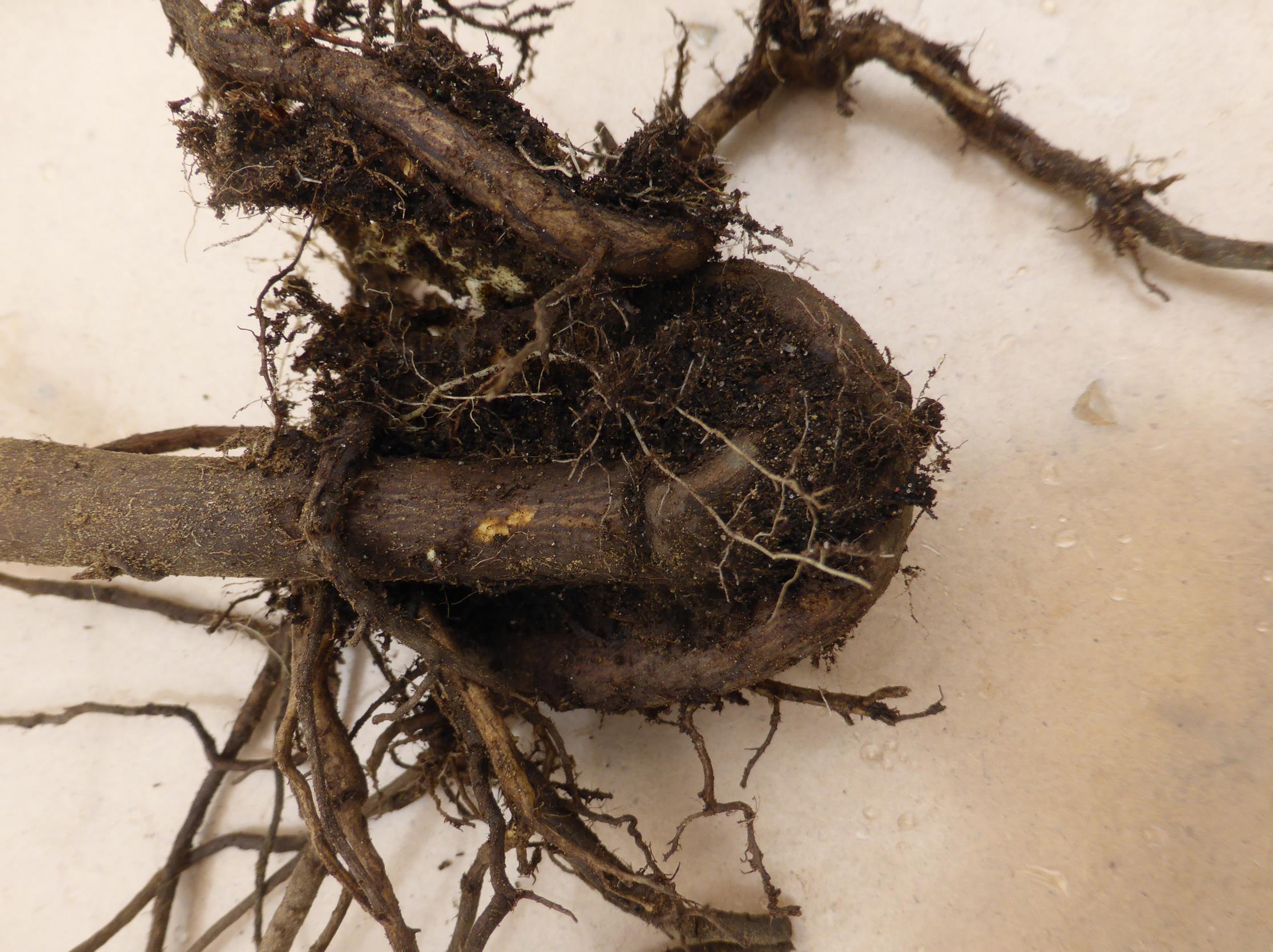 Légende: Spiralisation des racines d'un plant d'argousier dû à de mauvaises conditions de plantation.