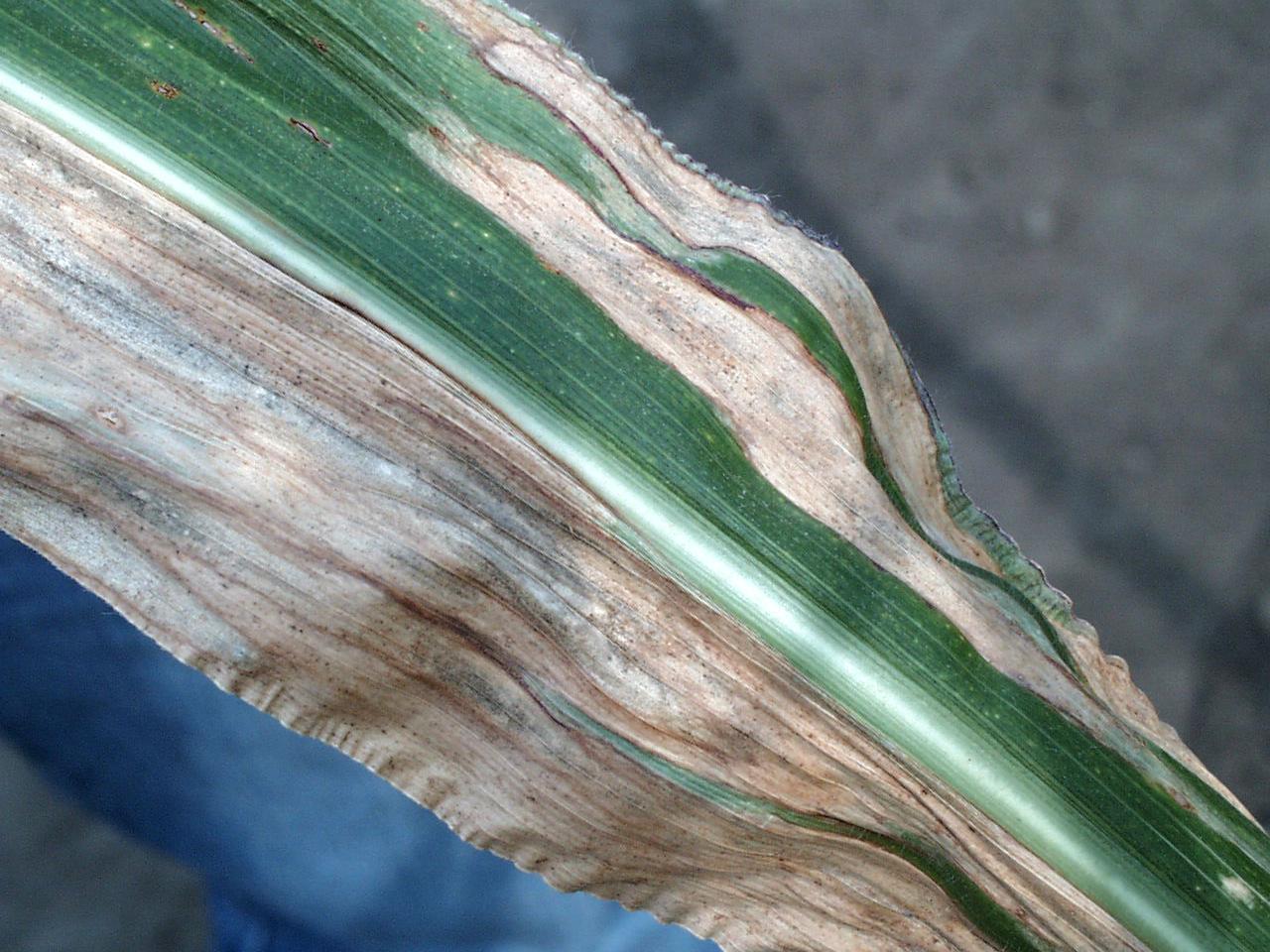 Légende: Grandes taches beiges sur feuille de maïs grain et fourrager