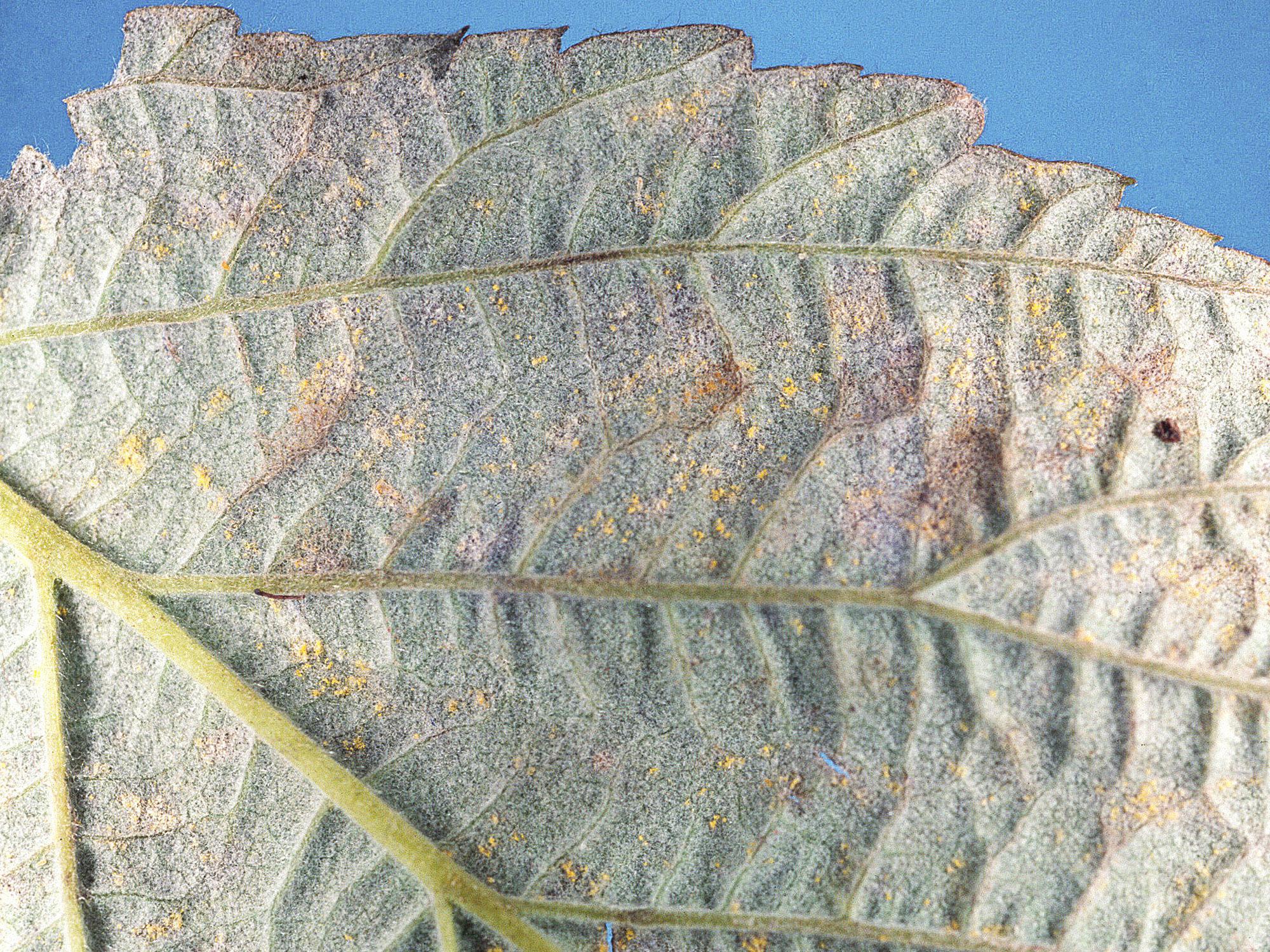 Description: Une vue rapprochée de la face inférieure d’une feuille de framboisier (cv 'Festival') montre une fine pellicule poudreuse jaunâtre à orange. Ce symptôme est caractéristique de la rouille jaune tardive du framboisier causée par le champignon Pucciniastrum americanum.