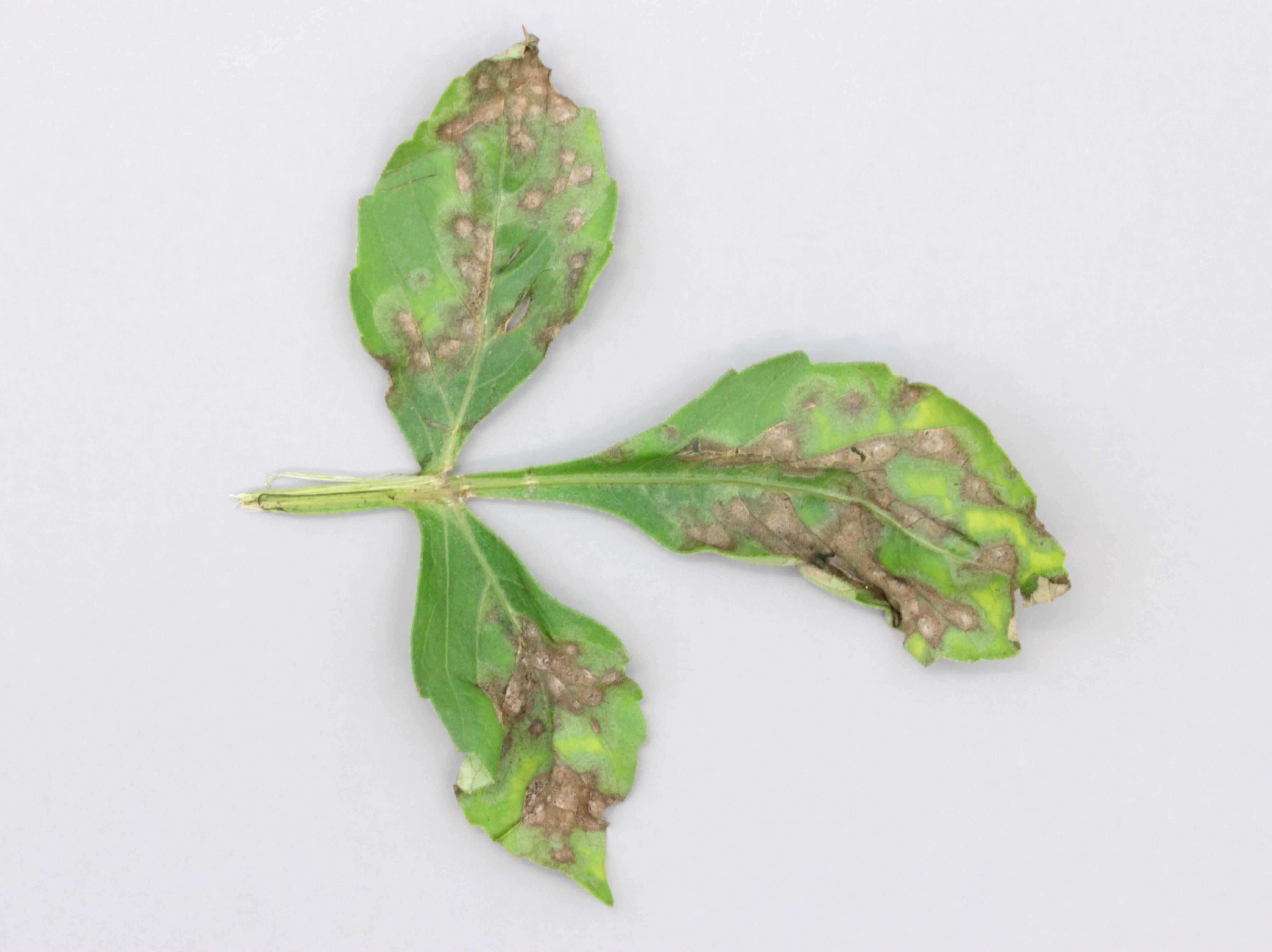 Description: Une feuille d’un dahlia montre des taches grisâtres avec une marge brune. Les taches mesurent entre 2 et 5 mm de diamètre et il y a entre huit et 15 taches par foliole. Les taches se groupent pour former de larges plages d’aspect brûlé. Seules les feuilles basales sont infectées. Les observations microscopiques ont révélé la présence du champignon Cercospora sp., responsable de la tache cercosporéenne chez le dahlia.