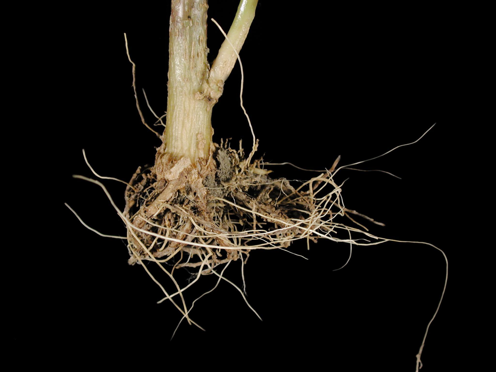 Description: Les racines d’un poinsettia sont pourries, brunes et le cortex se détache facilement. De petites stries longitudinales beiges sont visibles dans la partie basale de la tige. Les tests de laboratoire ont révélé la présence du champignon Phytophthora sp. dans les racines. Chez le poinsettia, P. nicotianae est l’espèce la plus fréquemment rapportée.