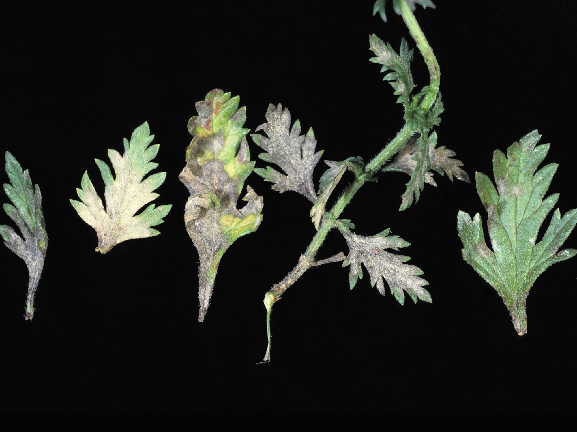 Légende: Brunissement et mycélium blanc sur feuilles de verveine
