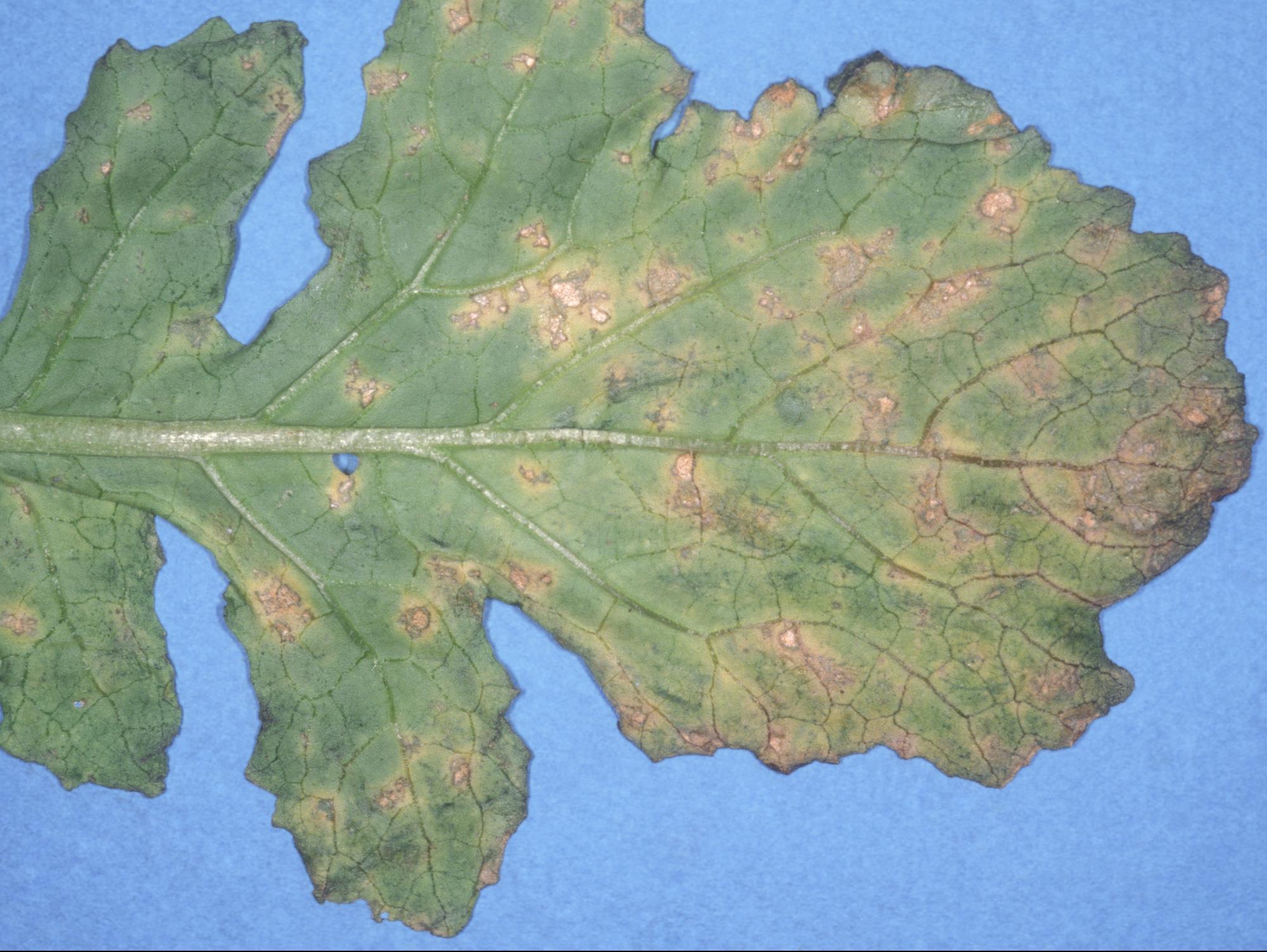 Description: À la face inférieure d’une feuille de navet provenant d’un champ, présence de nombreuses taches beiges avec une marge foncée, irrégulières à angulaires, parfois délimitées par les nervures et entourées d’un halo jaune. Les observations microscopiques ont révélé la présence de l'agent pathogène Hyaloperonospora parasitica, responsable du mildiou chez les crucifères.