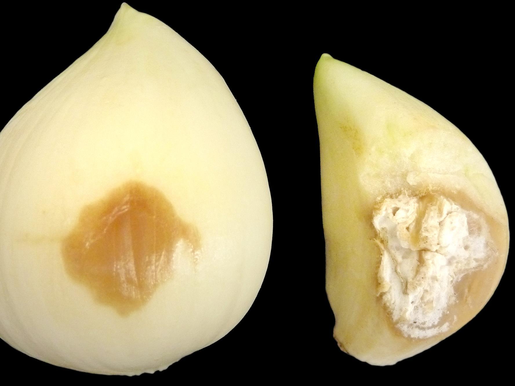 Légende: Taches et mycélium blanc sur gousses d'ail