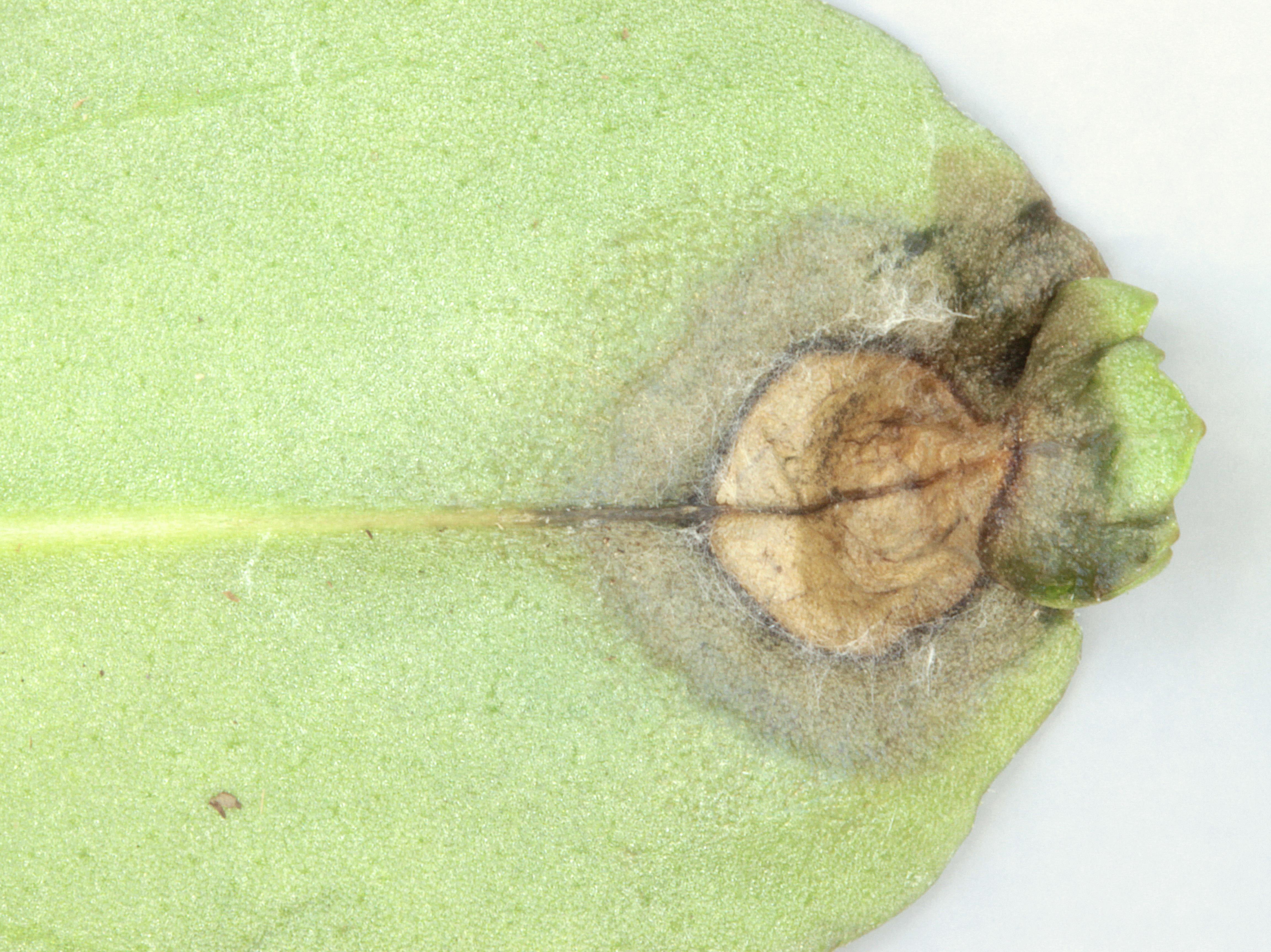 Description: Les feuilles de marguerites vivaces cultivées en serre montrent des taches de différente nature selon leur stade de développement. Les taches semblent débuter par l'apparition d'un halo jaune puis un brunissement apparaît ensuite au centre de ce halo (non visible ici). Certaines taches de plus grandes dimensions sont beiges à brunes, sèches et ne portent pas de halos jaunes. Les symptômes observés à la face inférieure de ces dernières taches sont similaires et un mycélium blanc est visible. Les taches sont présentes sur les trois niveaux de feuille. Les tests de laboratoire ont révélé la présence du champignon Myrothecium roridum. Ce champignon cause des taches foliaires chez plusieurs plantes ornementales.   La conseillère agricole mentionne que les conditions climatiques observées dans la serre au cours du mois d’avril ont été variables avec notamment des épisodes de température plus froide, une humidité relative élevée et la formation de condensation sur la structure de la serre.