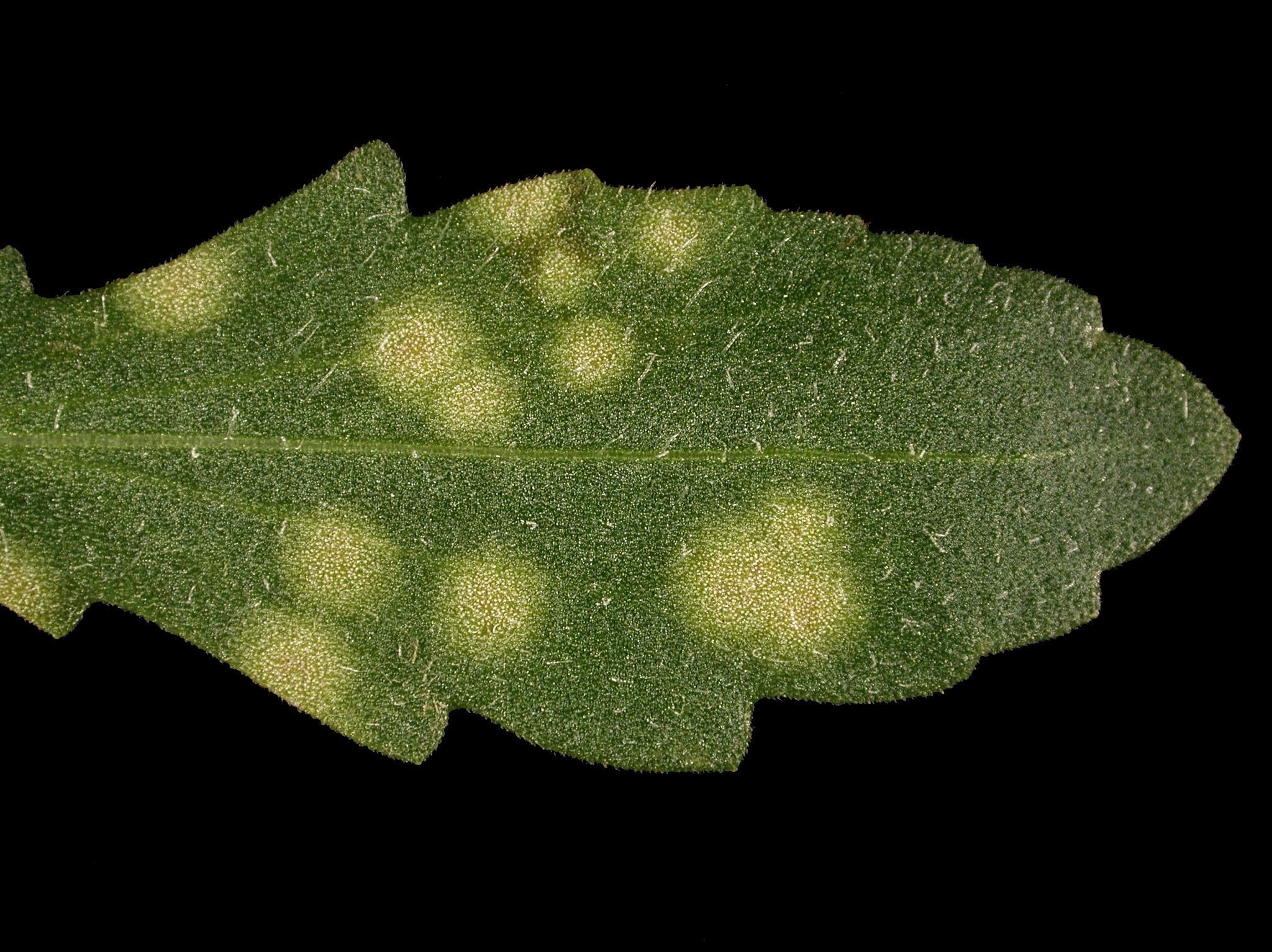 Description: Une feuille d'une gaillarde hybride (cv 'Bijou') cultivée en serre montre des taches circulaires blanches, d’un diamètre moyen de 5 mm. La maladie est plus sévère sur les vieilles feuilles. Les observations microscopiques ont révélé la présence du champignon Entyloma sp., responsable du charbon foliaire.