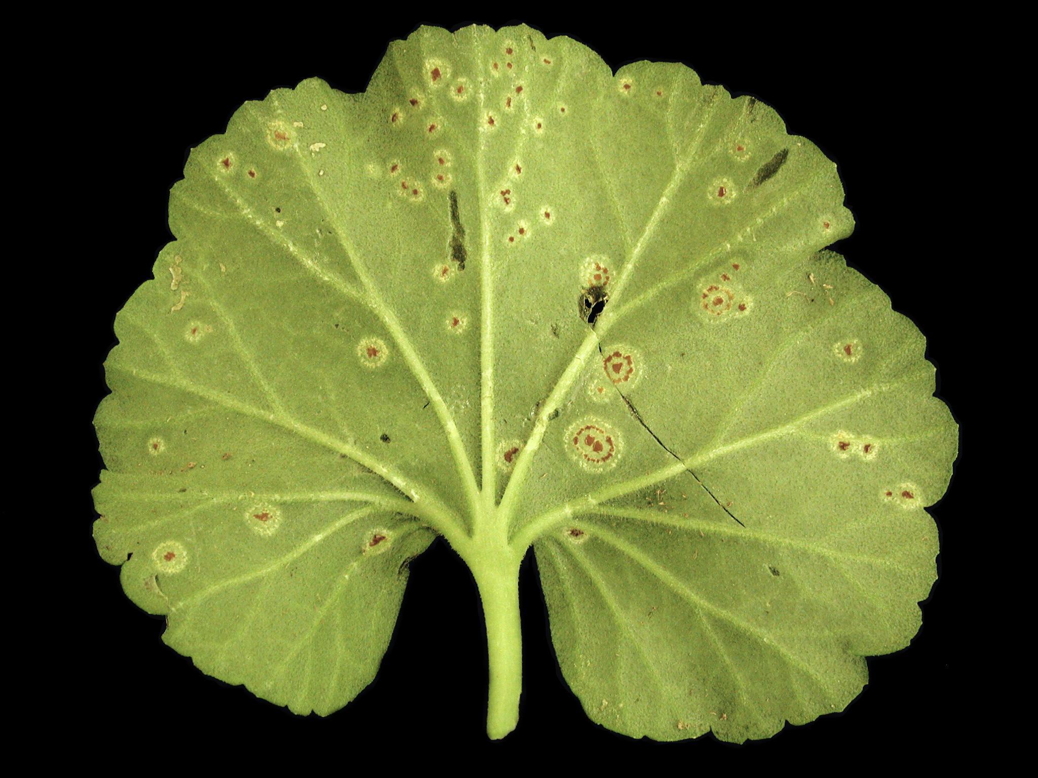Description: À la face inférieure d’une feuille de géranium, présence de petites taches circulaires jaunes contenant des pustules (urédies) brunâtres. Les pustules contiennent les urédospores. Vis-à-vis chacune des taches, il y a une tache circulaire jaune à la face supérieure (non visible ici). Les observations microscopiques ont révélé la présence du champignon Puccinia pelargonii-zonalis, responsable de la rouille du géranium.