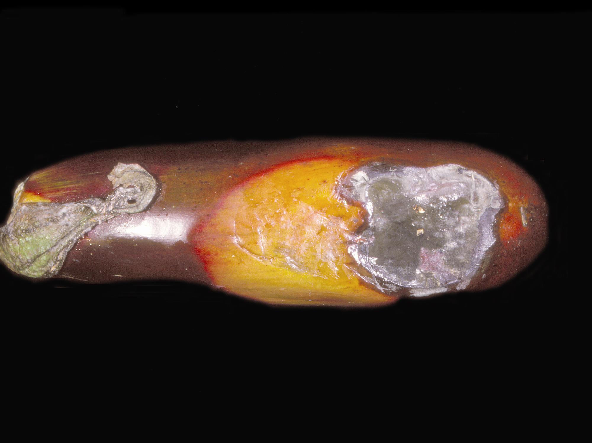 Description: Une aubergine montre une grande plage déprimée couverte d’un mycélium noirâtre. Les observations microscopiques ont révélé la présence du champignon Alternaria alternata, responsable de la pourriture alternarienne du fruit.