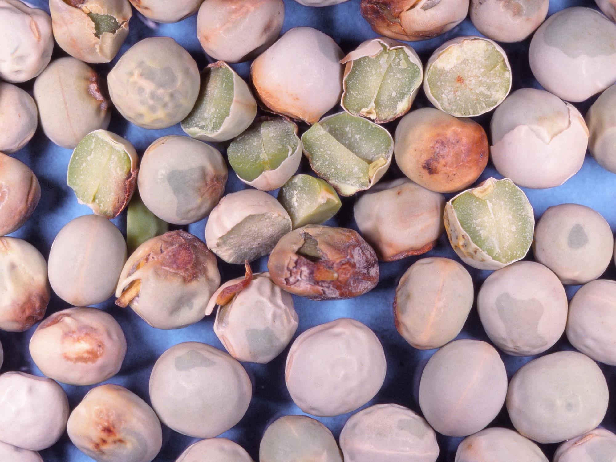 Description: Des pois verts secs sont partiellement brunis et ratatinés. Le tégument et un peu de tissus sous-jacents sont affectés. Les observations microscopiques ont révélé la présence du champignon Ascochyta sp., responsable de l’ascochytose du pois. Il s’agit probablement d’A. pisi.