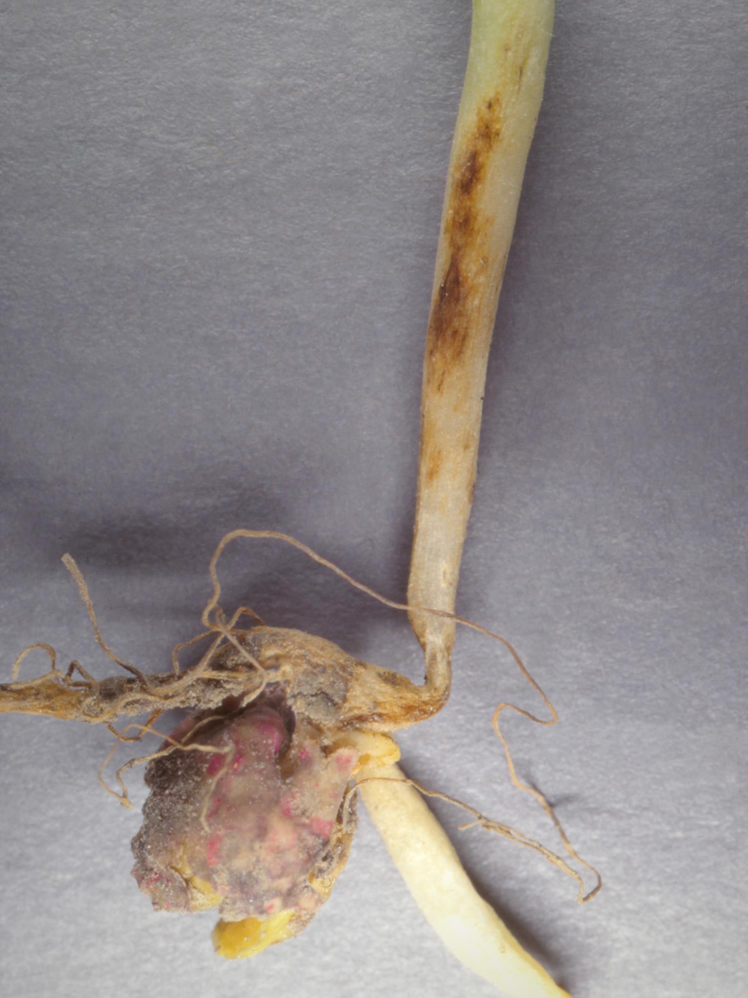 Description: Une vue rapprochée d’une plantule de pois montre une coloration brune sur l’épicotyle. Les tests de laboratoire ont révélé la présence du champignon Fusarium solani, responsable de la pourriture fusarienne des racines chez le pois. Il s’agit probablement de F. solani f. sp. pisi.