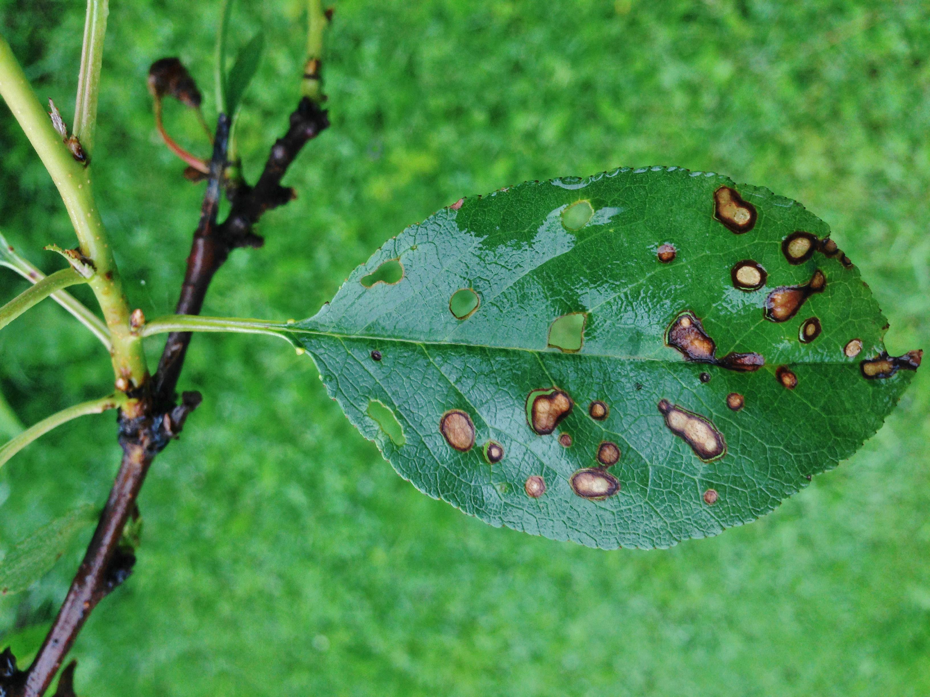 Légende: Feuilles de cerisier nain rustique infectées par la brûlure corynéenne (ou criblure) causée par Wilsonomyces carpophilus.