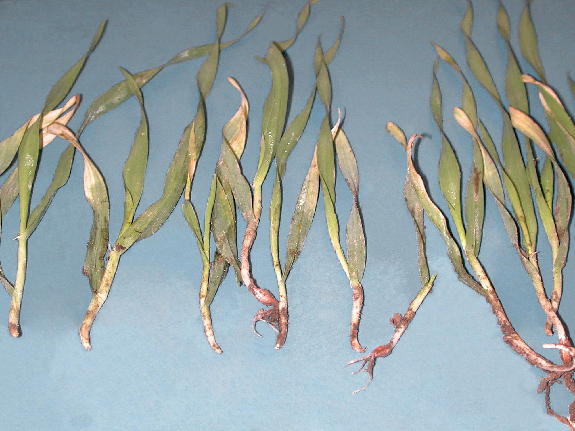Légende: Plants d'orge avec blanchiment des feuilles basales et système racinaire peu développé