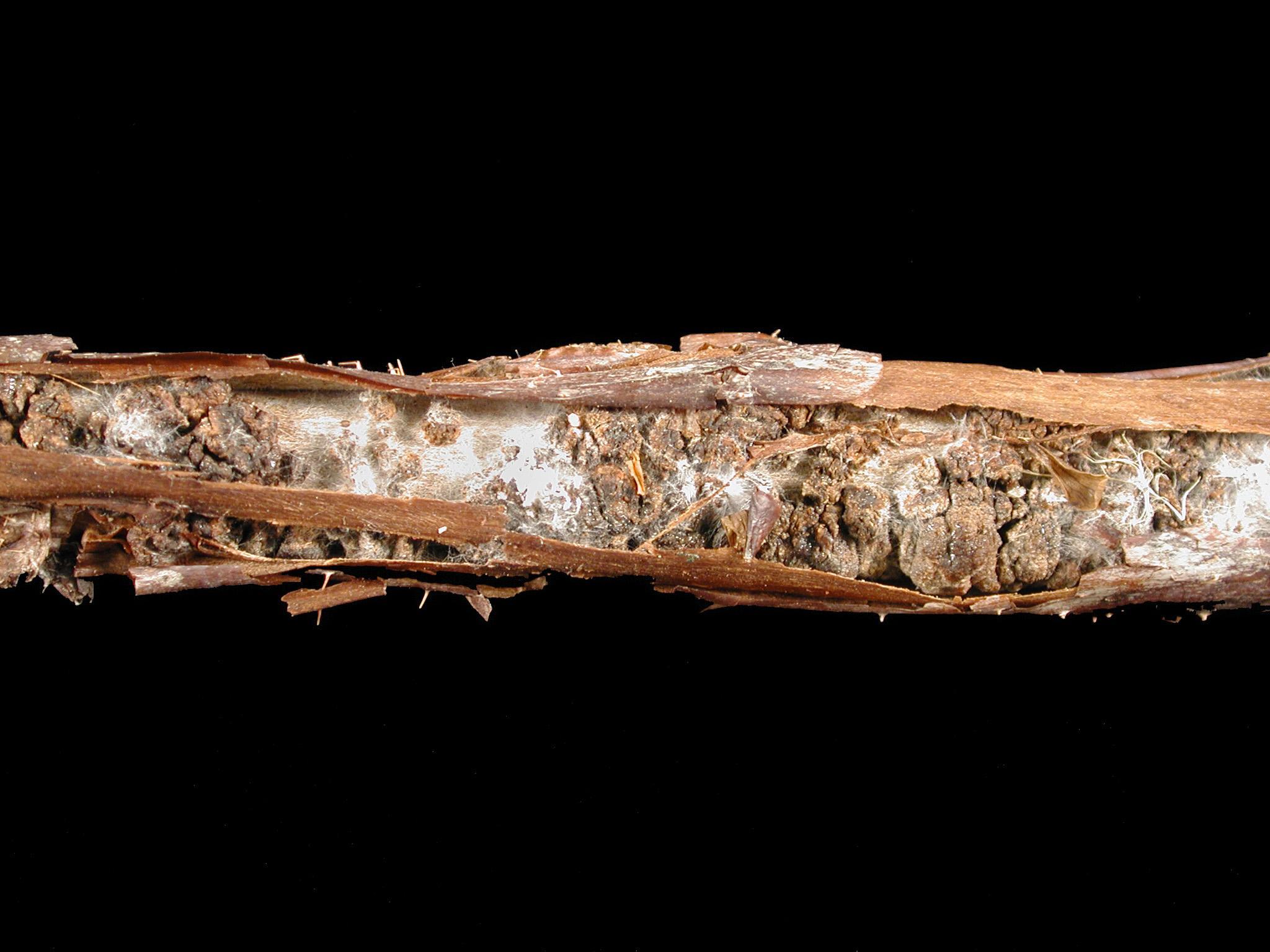 Description: Sur une tige fructifère d'un plant de framboisier, présence de nombreuses petites tumeurs sphériques brunes faisant irruption au travers de l'épiderme. Les tumeurs sont envahies par un mycélium blanchâtre et se regroupent pour couvrir presque toute la surface de la tige. Les tests de laboratoire ont révélé la présence de la bactérie Agrobacterium tumefaciens, responsable de la tumeur du collet.