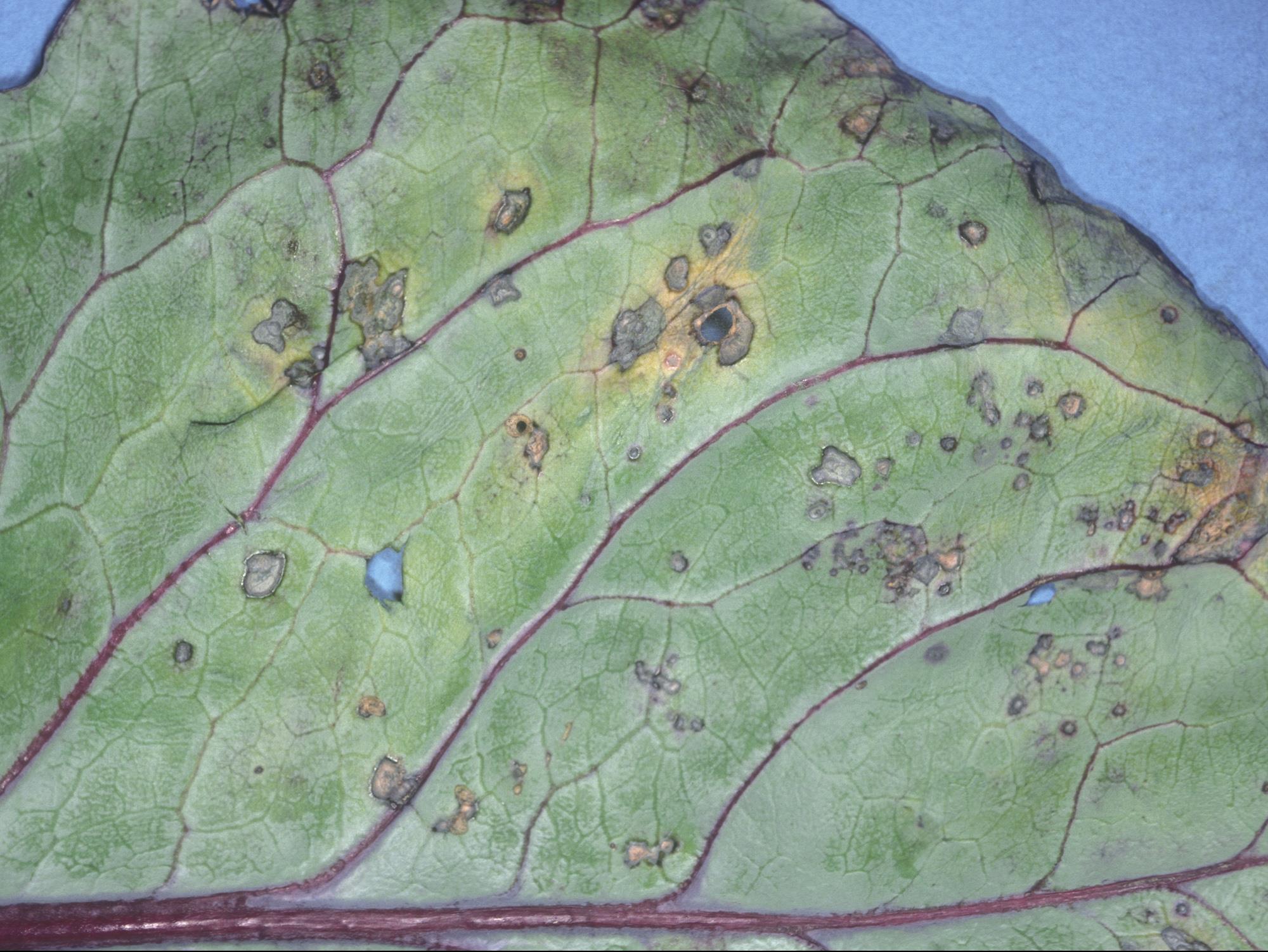 Description: À la face inférieure d’une feuille de chou rouge provenant d’un champ, présence de taches circulaires beiges à brunâtres avec une marge foncée et entourée ou non d’un halo jaune. Les taches sont réparties entre les nervures et elles sont souvent tombées. Les tests de laboratoire et de pouvoir pathogène sur des plantules de chou ont révélé la présence de la bactérie Xanthomonas campestris pv. armoraciae, responsable de la tache bactérienne.