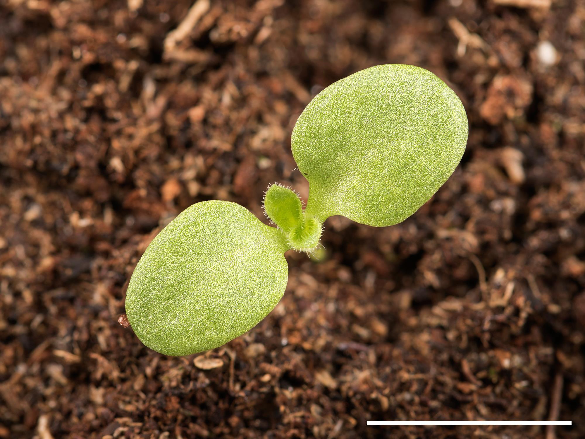 : Plantule à cotylédons oblongs, le trait horizontal = 1 cm