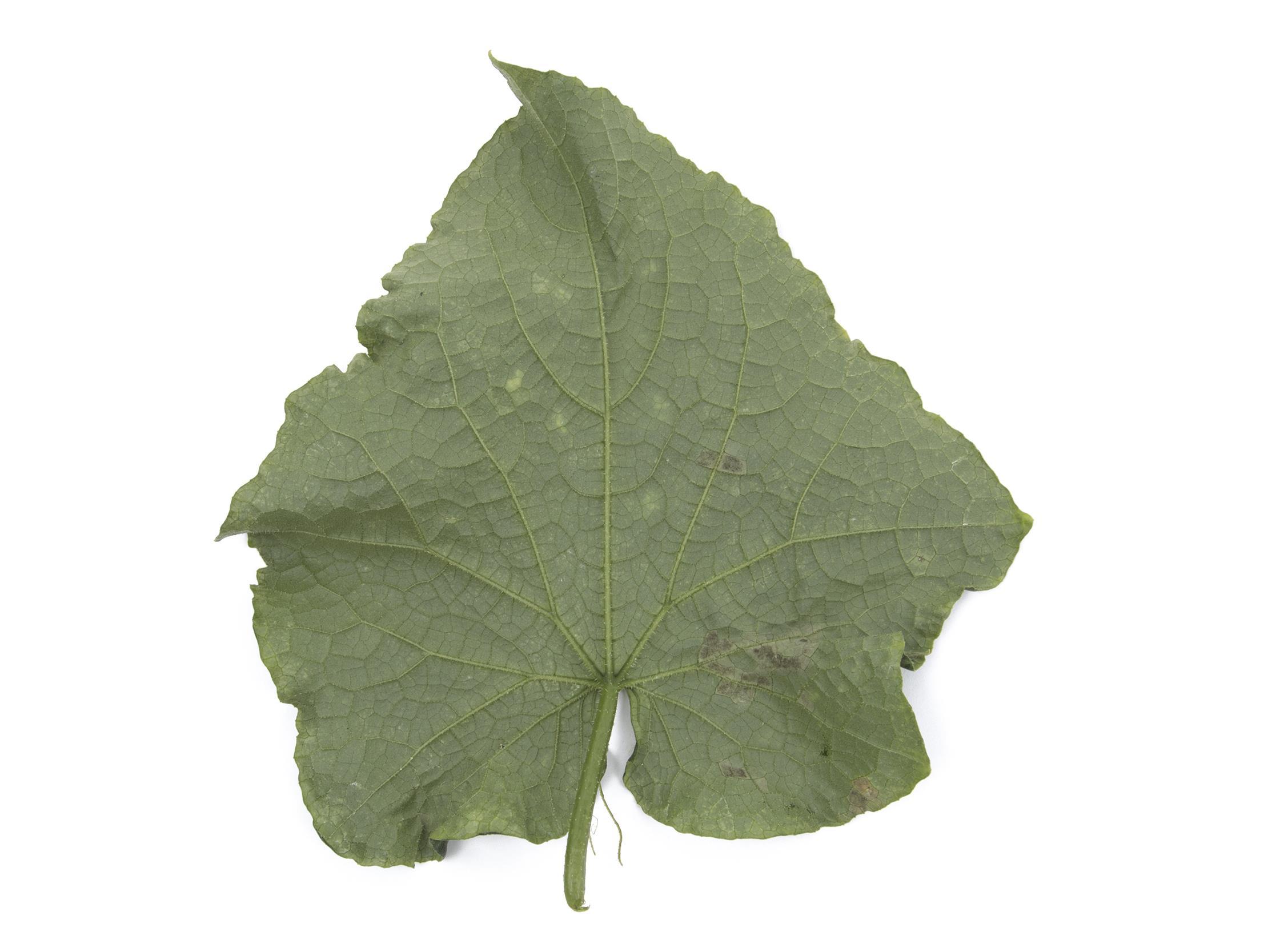 Légende: Symptôme du mildiou causé par Pseudoperonospora cubensis sur la face inférieure d'une feuille de concombre.