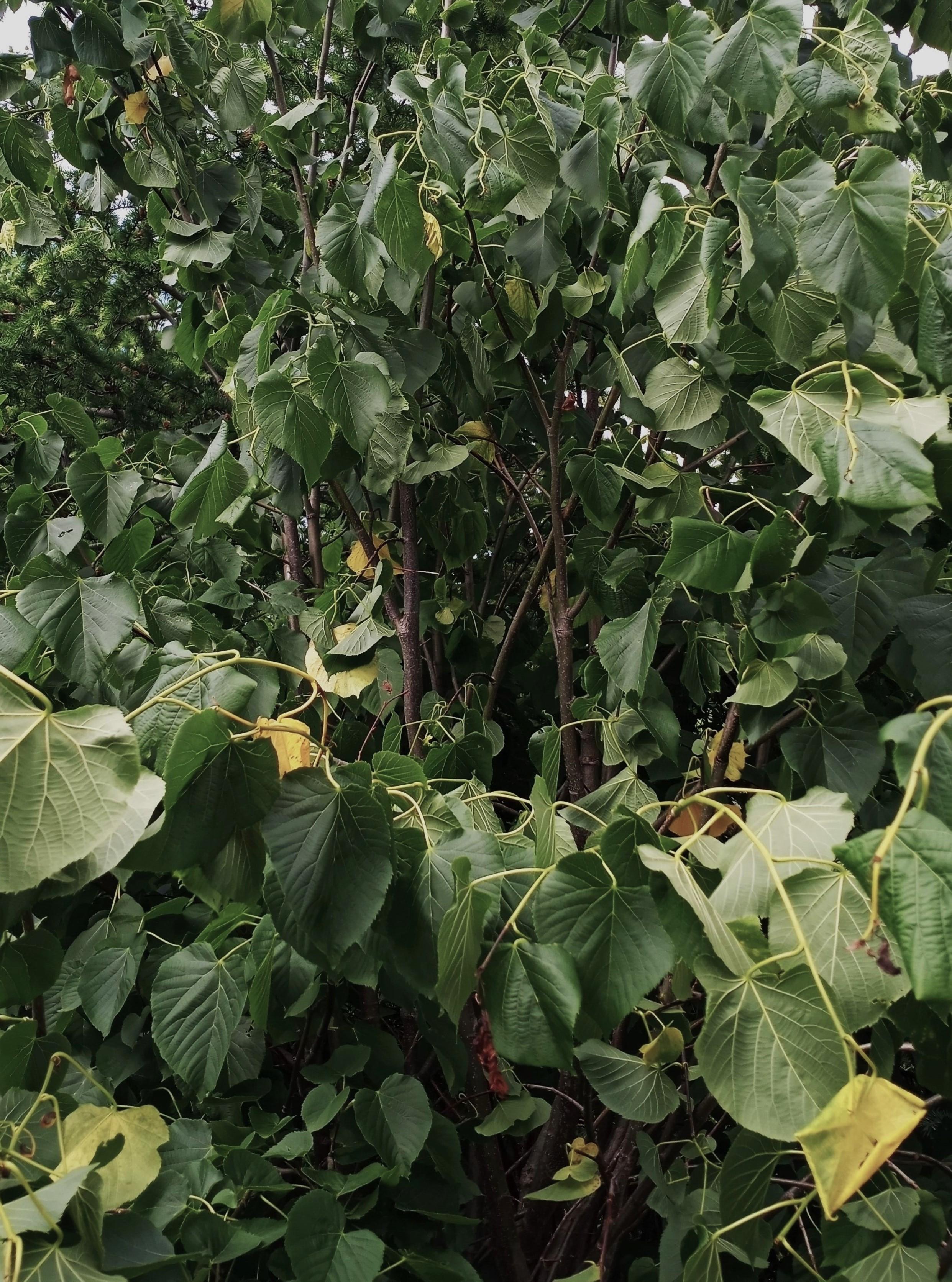 Légende: Feuilles et tiges de tilleul avec jaunissements et déformations