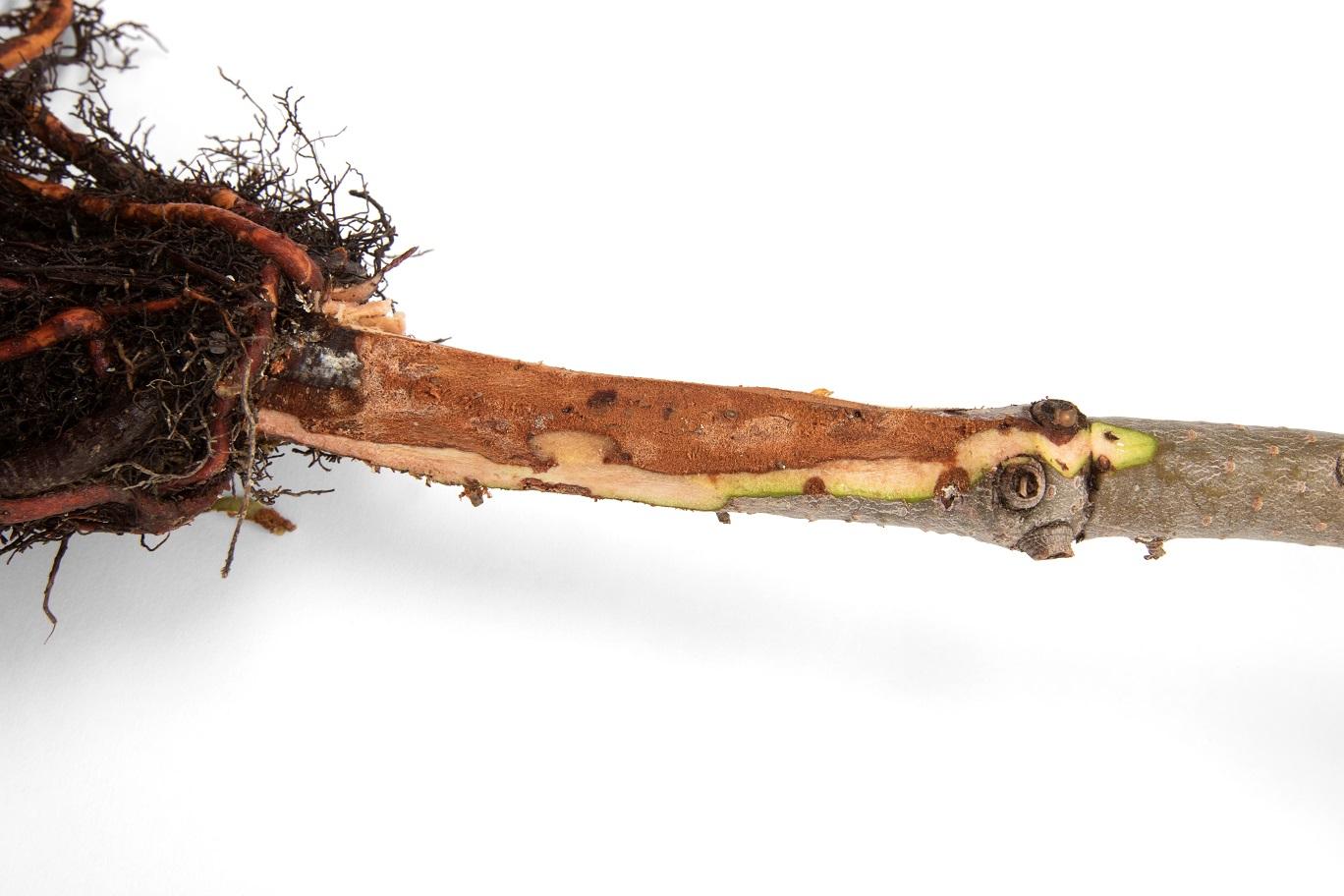 Description: Jeune plant de sapin Fraser affecté par Phytophthora abietivora, on peut observer un noircissement du système racinaire généralisé. Lorsqu’on gratte l’écorce au niveau du collet, on peut voir un chancre caractéristique de Phytophthora abietivora. Au niveau du chancre, les tissus sont brunis et délimités par une ligne plus foncée.