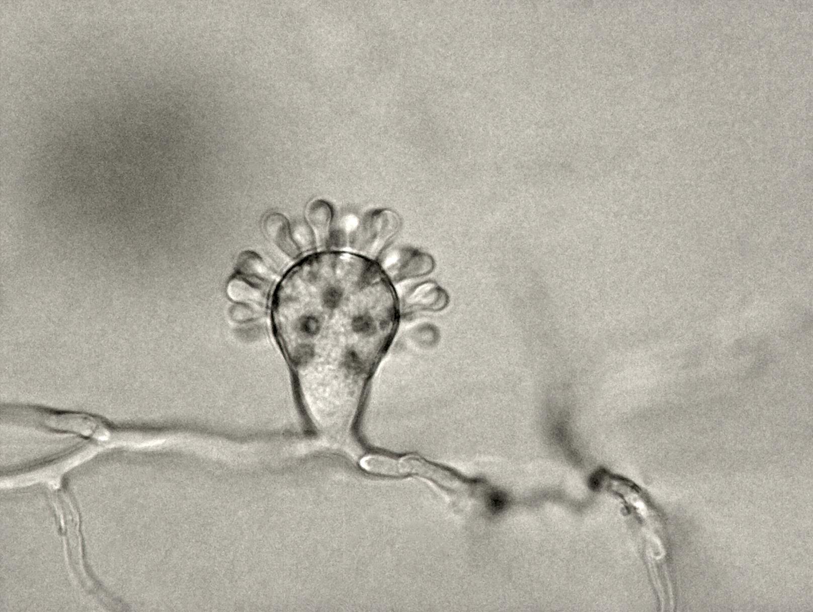 : Conidies immatures de Cephaliophora tropica se développant simultanément à partir d'une seule et unique cellule conidiogène globuleuse